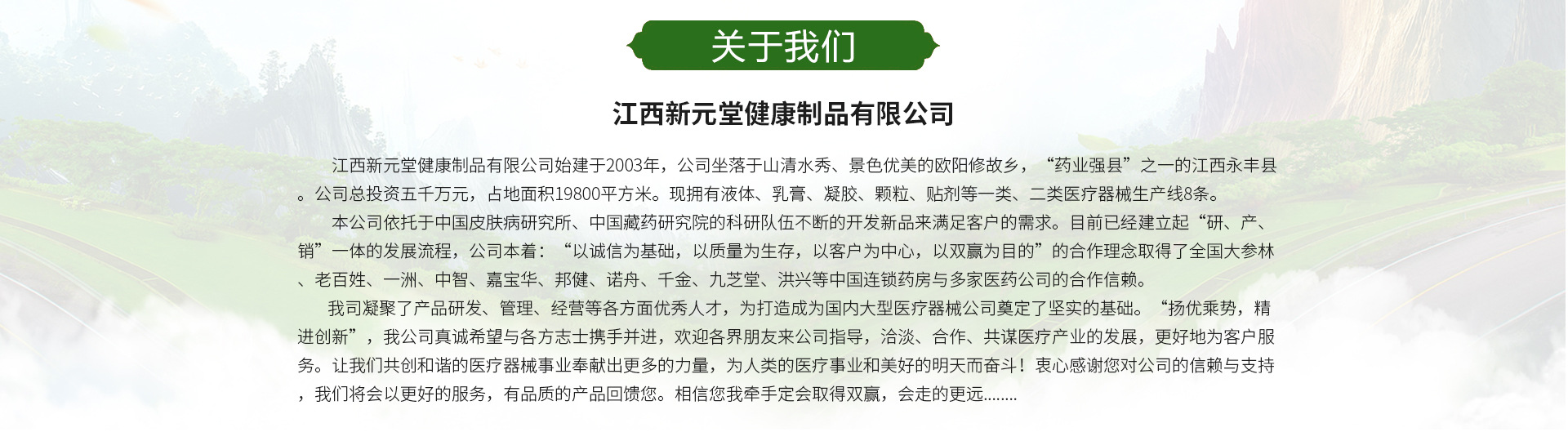 江西新元堂健康制品有限公司始建于2003年,公司坐落于山清水秀、人杰地靈的歐陽修故鄉(xiāng),十大“藥業(yè)強縣”之一的江西永豐縣。公司總投資五千萬元,占地面積19800平方米?,F(xiàn)擁有液體、乳膏、凝膠、顆粒、貼劑等一類、二類醫(yī)療器械生產(chǎn)線8條。本公司依托于中國皮膚病研究所、中國藏藥研究院的強大科研隊伍不斷的開發(fā)新品來滿足客戶的需求。目前已經(jīng)建立起“研、產(chǎn)、銷”一體的發(fā)展流程,公司本著:“以誠信為基礎(chǔ),以質(zhì)量為生存,以客戶為中心,以雙贏為目的”的合作理念取得了修正、全國大參林、益豐大藥房、老百姓大藥房、一洲、中智、嘉寶華、邦健、諾舟、千金、九芝堂、洪興等中國百強連鎖藥房與上千家醫(yī)藥公司的合作信賴。衷心感謝您對公司的信賴與支持,我們將會以更好的服務(wù),更優(yōu)質(zhì)的產(chǎn)品回饋您。相信您我牽手定會取得雙贏,會走的更遠........