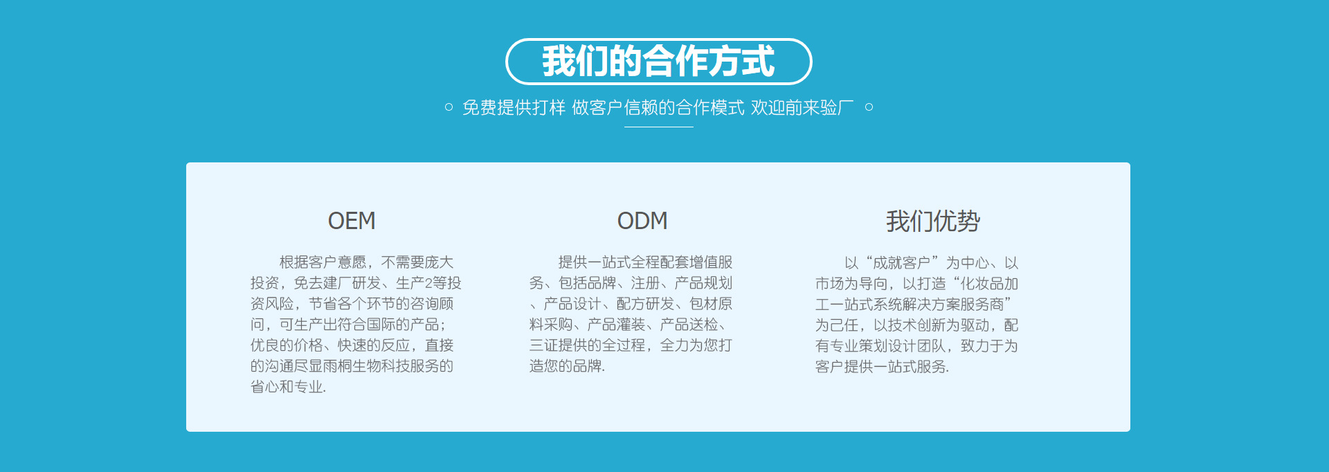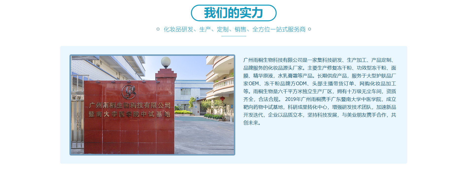 廣州雨桐生物科技有限公司是一家集科技研發(fā)、生產(chǎn)加工、產(chǎn)品定制、品牌服務(wù)的化妝品源頭廠家。主要生產(chǎn)修復(fù)凍干粉、功效型凍干粉、面膜、精華原液,水乳膏霜等產(chǎn)品。長期供應(yīng)產(chǎn)品,服務(wù)于大型護(hù)膚品廠家OEM、凍干粉品牌方ODM、頭部主播帶貨訂單、網(wǎng)購化妝品加工等。雨桐生物是六千平方米獨(dú)立生產(chǎn)廠區(qū),擁有十萬級無塵車間,資質(zhì)齊全,合法合規(guī)。 2019年廣州雨桐攜手廣東暨南大學(xué)中醫(yī)學(xué)院,成立靶向藥物中試基地,科研成果轉(zhuǎn)化中心,增強(qiáng)研發(fā)技術(shù)團(tuán)隊(duì),加速新品開發(fā)迭代,企業(yè)以品質(zhì)立本,堅(jiān)持科技發(fā)展,與美業(yè)朋友攜手合作,共創(chuàng)未來。