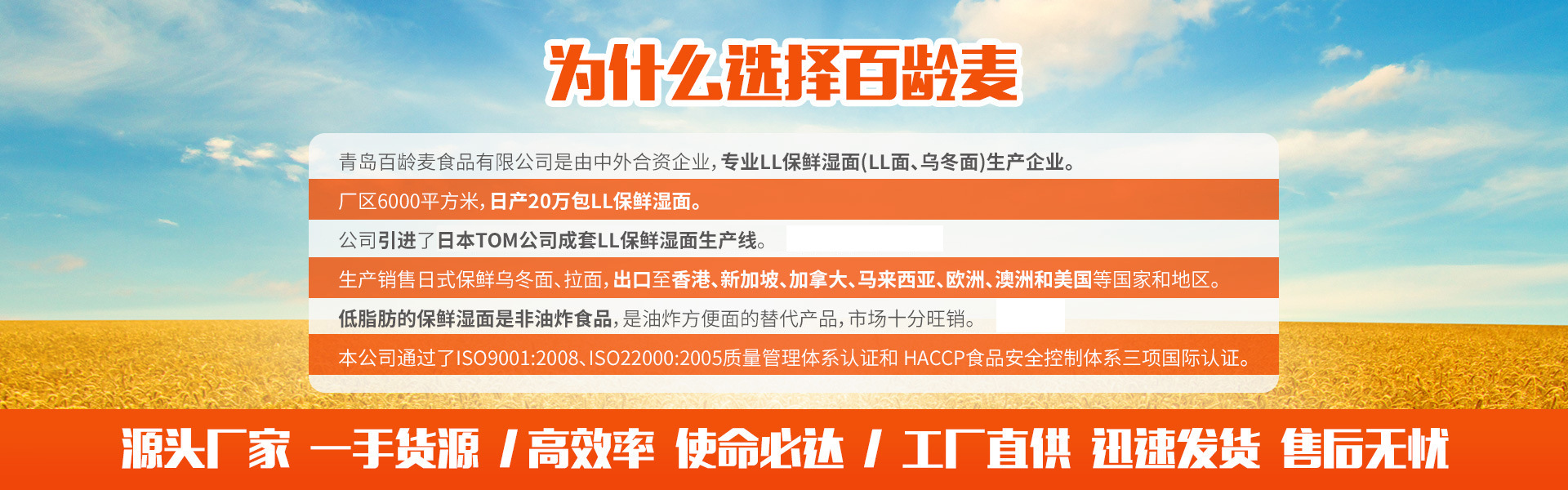 青島百齡麥?zhǔn)称酚邢薰臼切录悠掳冽g麥集團(tuán)公司下屬企業(yè),由中外合資企業(yè)青島星華糧油食品有限公司與香港廣泰代理有限公司合資興建的專業(yè)LL保鮮濕面(LL面、烏冬面)生產(chǎn)企業(yè)。公司成立于2003年6月,2003年12月正式試生產(chǎn),注冊資本為121萬美元,投資總額近3000萬人民幣。廠區(qū)6000平方米,日產(chǎn)20萬包LL保鮮濕面。 公司引進(jìn)了日本TOM公司成套LL保鮮濕面生產(chǎn)線,生產(chǎn)銷售日式保鮮烏冬面、拉面,出口至香港、新加坡、加拿大、馬來西亞、歐洲、澳洲和美國等國家和地區(qū)。低脂肪、非油炸的保鮮濕面是油炸方便面的替代產(chǎn)品,市場十分旺銷。 本公司擁有自主出口權(quán),產(chǎn)品獲得美國FDA認(rèn)證。通過了ISO9001:2008、ISO22000:2005質(zhì)量管理體系認(rèn)證、 HACCP食品安全控制體系、BRC國際認(rèn)證四項(xiàng)國際認(rèn)證。產(chǎn)品質(zhì)量放心可靠