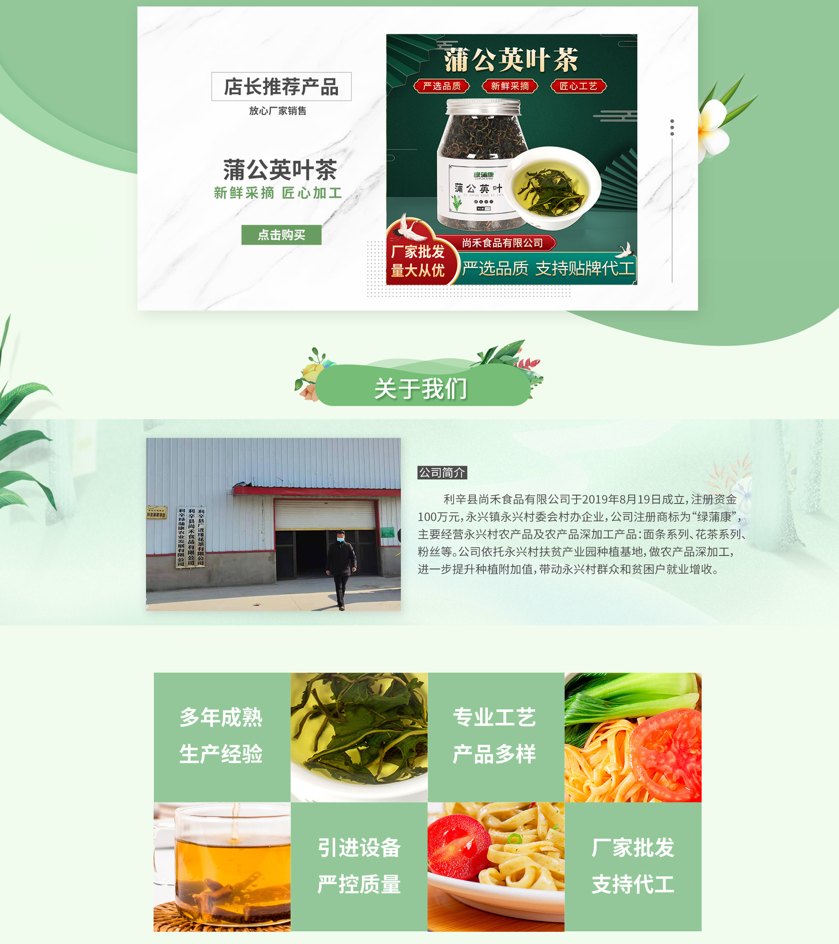 利辛縣尚禾食品有限公司于2019年8月19日成立,注冊(cè)資金100萬元,永興鎮(zhèn)永興村委會(huì)村辦企業(yè),公司注冊(cè)商標(biāo)為“綠蒲康”,主要經(jīng)營永興村農(nóng)產(chǎn)品及農(nóng)產(chǎn)品深加工產(chǎn)品:面條系列、花茶系列、粉絲等。公司依托永興村扶貧產(chǎn)業(yè)園種植基地,做農(nóng)產(chǎn)品深加工,進(jìn)一步提升種植附加值,帶動(dòng)永興村群眾和貧困戶就業(yè)增收