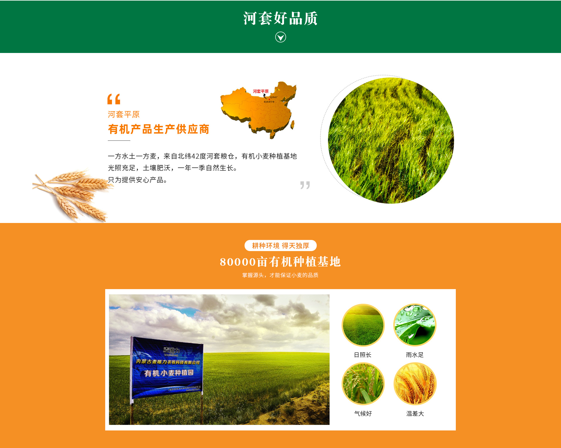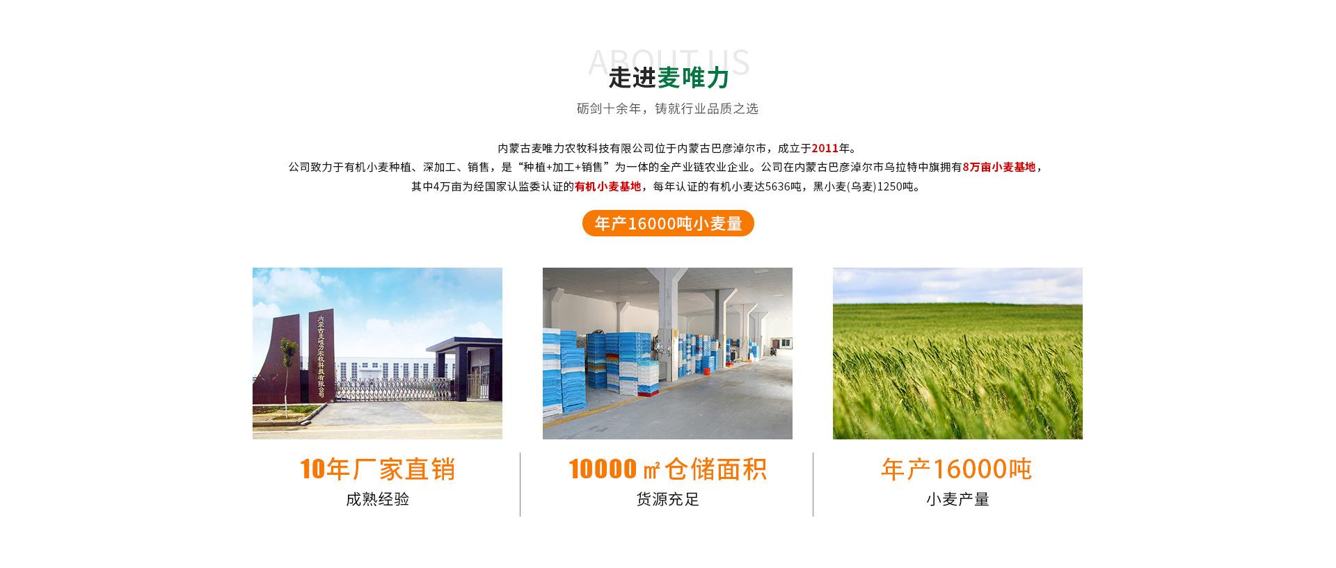 內(nèi)蒙古麥唯力農(nóng)牧科技有限公司成立于2011年,位于內(nèi)蒙古巴彥淖爾市。公司致力于有機(jī)小麥種植、精深加工、銷(xiāo)售及有機(jī)產(chǎn)品開(kāi)發(fā),以 “種植+加工+銷(xiāo)售”為一體的全產(chǎn)業(yè)鏈農(nóng)業(yè)企業(yè)。公司在內(nèi)蒙古巴彥淖爾市烏拉特中旗擁有8萬(wàn)畝小麥基地,年產(chǎn)小麥16000噸,其中8萬(wàn)畝為經(jīng)國(guó)家認(rèn)監(jiān)委認(rèn)證的有機(jī)小麥基地,每年認(rèn)證的有機(jī)小麥達(dá)5000噸,是內(nèi)蒙古河套地區(qū)最大的有機(jī)小麥種植基地。 同時(shí),公司利用小麥基地周邊得天獨(dú)厚的自然條件,在烏拉特中旗天然草場(chǎng)飼養(yǎng)了無(wú)公害自然放養(yǎng)的草坡羊,并向國(guó)家認(rèn)監(jiān)委申請(qǐng)認(rèn)證了30000只有機(jī)羊。 并且,公司還整合了巴彥淖爾優(yōu)質(zhì)雜糧及健康食用油等產(chǎn)品,將巴彥淖爾健康、綠色、營(yíng)養(yǎng)價(jià)值極高的農(nóng)產(chǎn)品推向千家萬(wàn)戶(hù)。