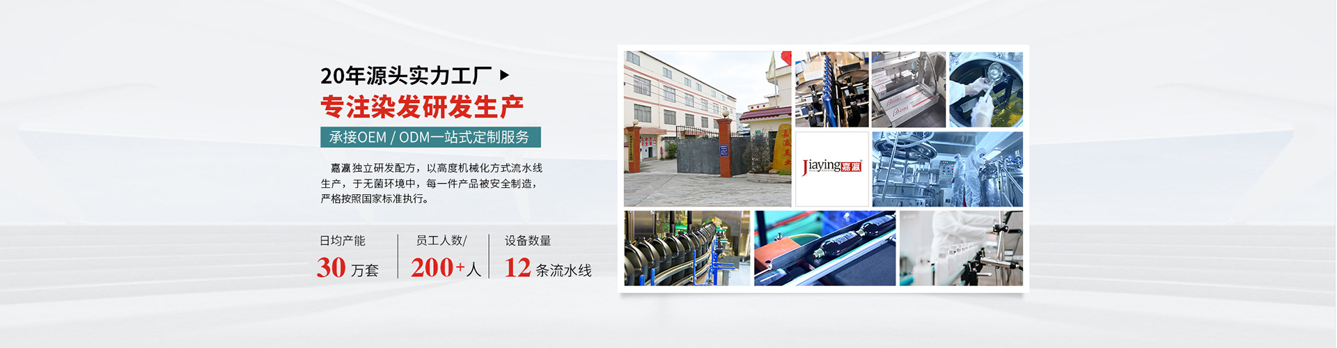 廣州嘉瀛化妝品有限公司,成立于2005年6月18日,是目前國內(nèi)最大的專業(yè)美發(fā)品研發(fā)生產(chǎn)銷售型企業(yè)。總部設(shè)在廣東省廣州市?,F(xiàn)企業(yè)占地面積2.8萬平米,擁有10條全自動染音生產(chǎn)線和GMP無菌洗護造型產(chǎn)品專業(yè)生產(chǎn)車間。特證植物配方、 一色一證。彩色蓋白發(fā),原生發(fā)一步到位,無需漂色, 可私人定制0EM、0DM