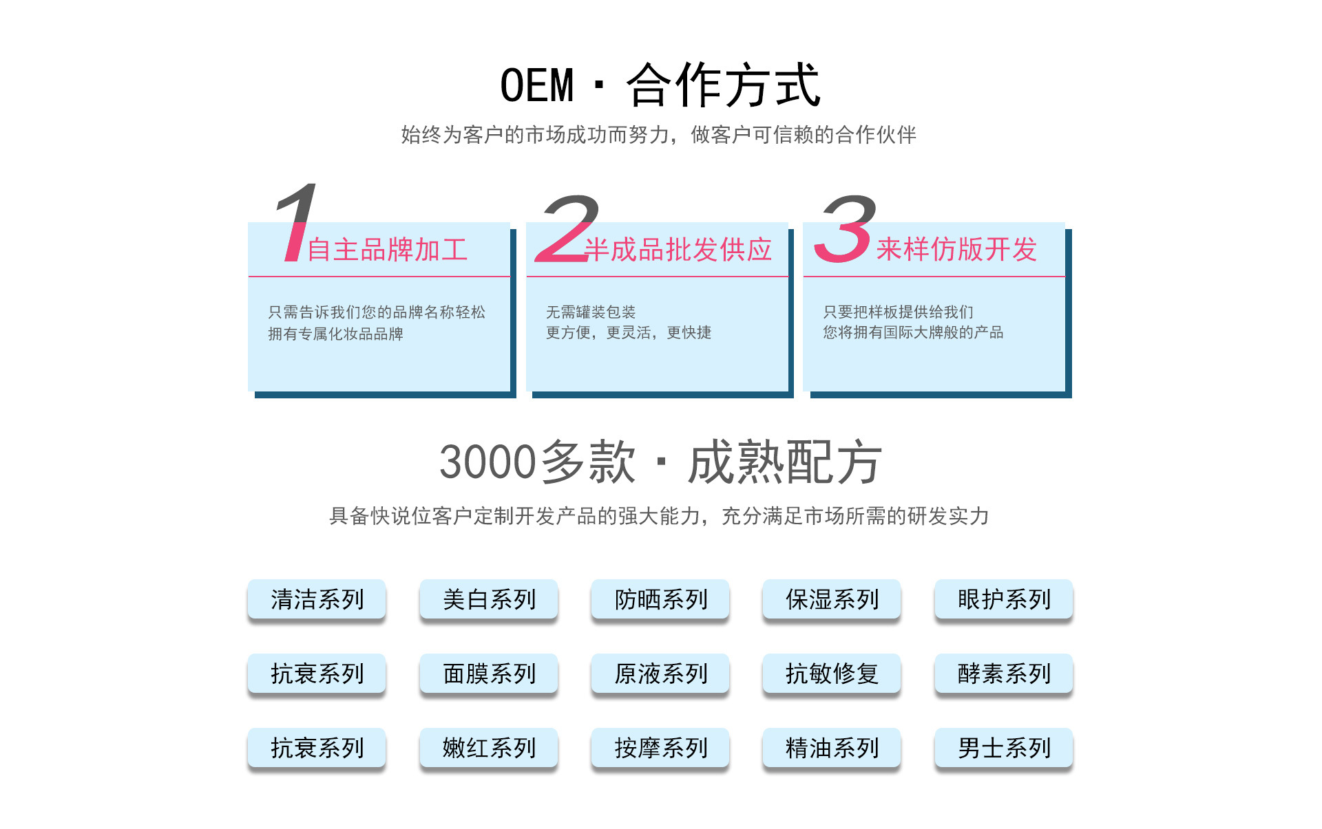 產(chǎn)品:祛皺、祛斑、祛痘、美白、面膜貼片等系列最專業(yè)的全國(guó)十大OEM/ODM企業(yè)之一。
