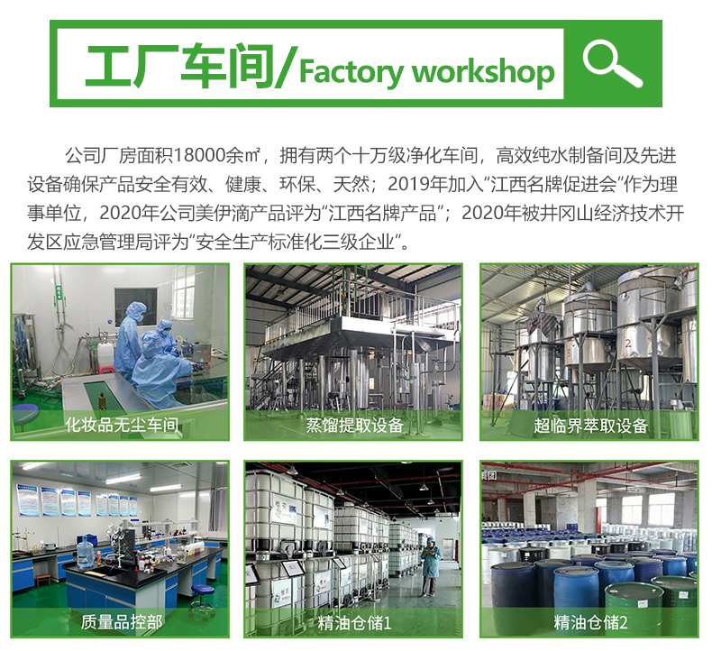 公司技術(shù)和研發(fā)實(shí)力雄厚,與江西農(nóng)業(yè)大學(xué)林學(xué)院、河北大學(xué)中醫(yī)學(xué)院取得合作,建立江西農(nóng)業(yè)大學(xué)林產(chǎn)化工專業(yè)工作站和河北大學(xué)中醫(yī)學(xué)院產(chǎn)學(xué)研工作站;2020年~2021年已連續(xù)兩年入庫(kù)“科技型中小企業(yè)”,2020年評(píng)為“高新技術(shù)企業(yè)”,同年與井岡山大學(xué)聯(lián)合建立“吉安市芳香精油技術(shù)創(chuàng)新中心”,并通過(guò)吉安市科技局審批;2021年4月成立“青原芳香精油健康產(chǎn)業(yè)知識(shí)產(chǎn)權(quán)聯(lián)盟”,公司作為聯(lián)盟主席單位。公司廠房面積18000余㎡,擁有兩個(gè)十萬(wàn)級(jí)凈化車(chē)間,高效純水制備間及先進(jìn)設(shè)備確保產(chǎn)品安全有效、健康、環(huán)保、天然;2019年加入“江西名牌促進(jìn)會(huì)”作為理事單位,2020年公司美伊滴產(chǎn)品評(píng)為“江西名牌產(chǎn)品”;2020年被井岡山經(jīng)濟(jì)技術(shù)開(kāi)發(fā)區(qū)應(yīng)急管理局評(píng)為“安全生產(chǎn)標(biāo)準(zhǔn)化三級(jí)企業(yè)”。