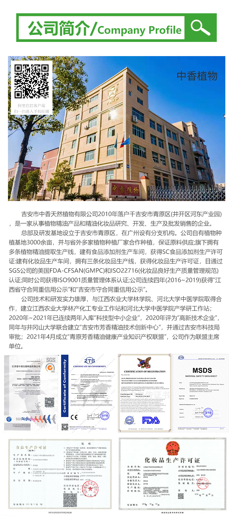 總部及研發(fā)基地設(shè)立于吉安市青原區(qū),在廣州設(shè)有分支機(jī)構(gòu)。公司自有植物種植基地3000余畝,并與省外多家植物種植廠家合作種植,保證原料供應(yīng);旗下?lián)碛卸鄺l植物精油提取生產(chǎn)線,建有食品添加劑生產(chǎn)車(chē)間,獲得SC食品添加劑生產(chǎn)許可證:建有化妝品生產(chǎn)車(chē)間,擁有三條化妝品生產(chǎn)線,獲得化妝品生產(chǎn)許可證,目通過(guò)SGS公司的美國(guó)FDA-CFSAN(GMPC)和ISO22716(化妝品良好生產(chǎn)質(zhì)量管理規(guī)范)認(rèn)證;同時(shí)公司獲得ISO9001質(zhì)量管理體系認(rèn)證;公司連續(xù)四年(2016~2019)獲得“江西省守合同重信用公示”和“吉安市守合同重信用公示”。