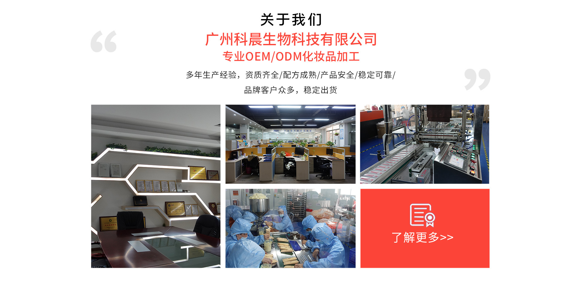 廣州科晨生物科技有限公司是化妝品代加工、現(xiàn)貨銷售等產(chǎn)品專業(yè)生產(chǎn)加工的公司,擁有完整、科學(xué)的質(zhì)量管理體系。廣州科晨生物科技有限公司的誠(chéng)信、實(shí)力和產(chǎn)品質(zhì)量獲得業(yè)界的認(rèn)可。歡迎各界朋友蒞臨參觀、指導(dǎo)和業(yè)務(wù)洽談。