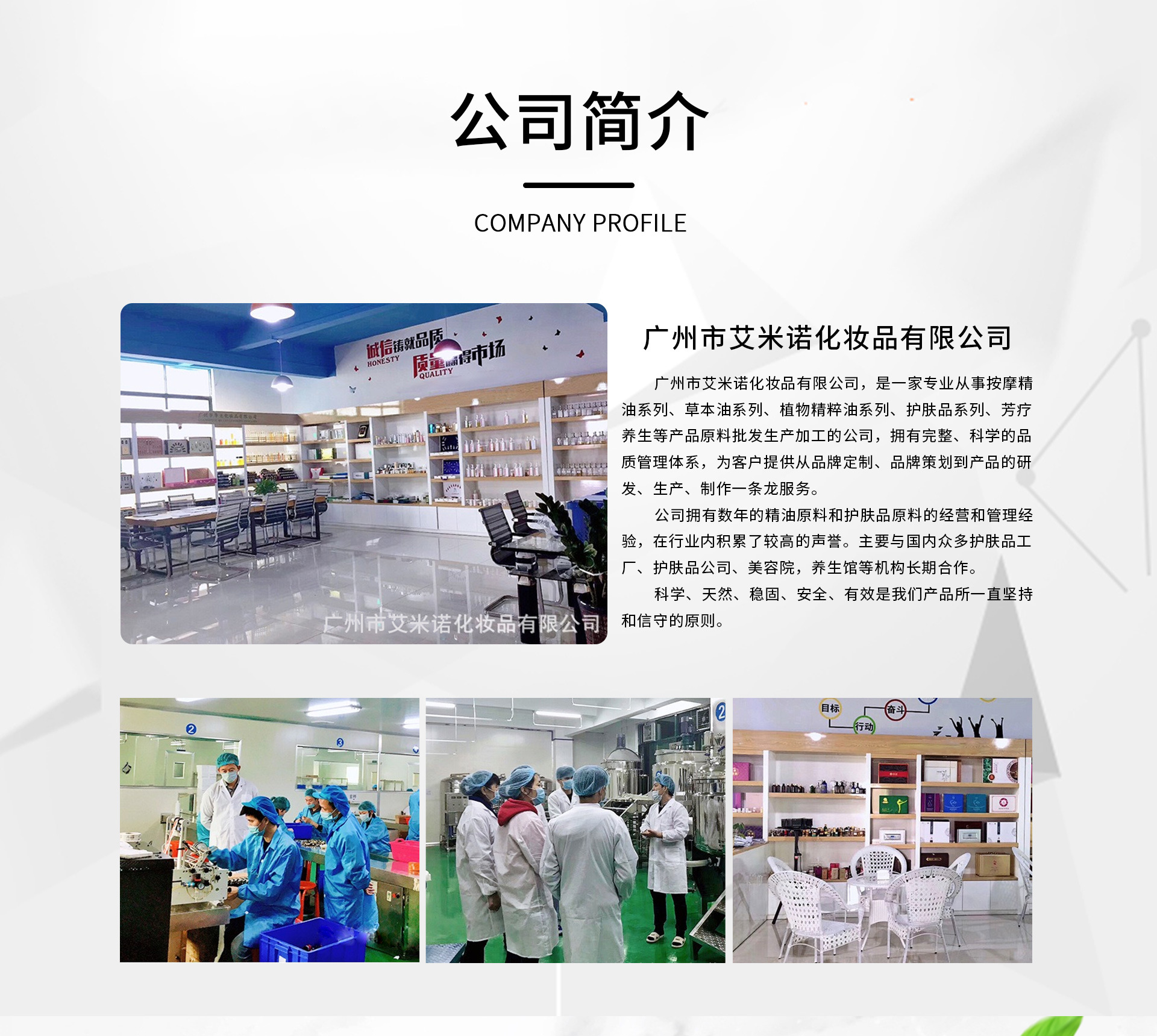 廣州市艾米諾化妝品有限公司是精油護膚、精油護膚等產(chǎn)品專業(yè)生產(chǎn)加工的公司,擁有完整、科學(xué)的質(zhì)量管理體系。廣州市艾米諾化妝品有限公司的誠信、實力和產(chǎn)品質(zhì)量獲得業(yè)界的認(rèn)可。歡迎各界朋友蒞臨參觀、指導(dǎo)和業(yè)務(wù)洽談。
