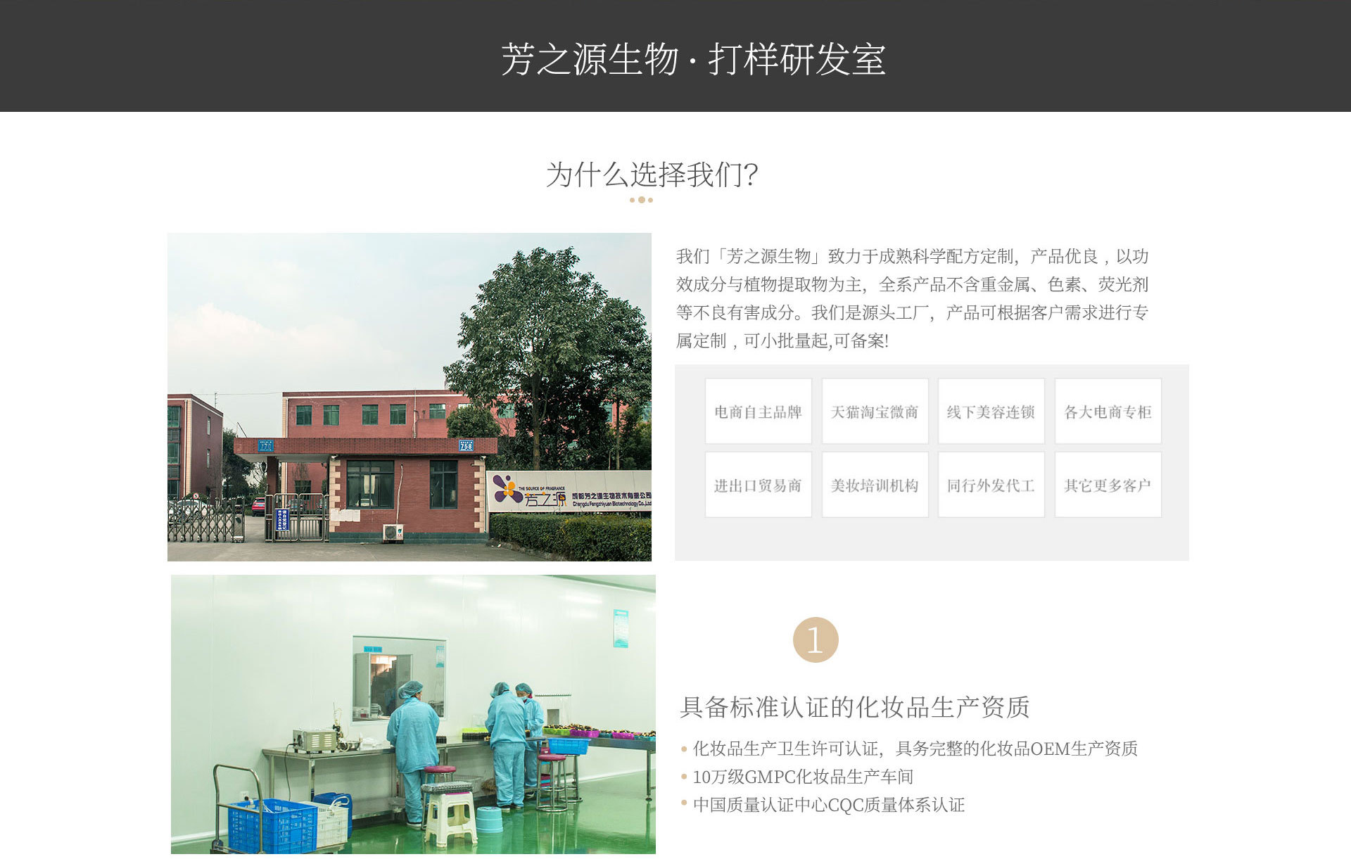 我們誕生于 2000 年,那個洗臉還在用肥皂的年代 我們的工程師已然專研純植物護理肌膚的產(chǎn)品配方。 2007 年我們建廠于成都市高新西區(qū),在大量的生產(chǎn)加工過程中,不斷發(fā)現(xiàn),反復思考,用心記錄。 2010 年我們進駐成都市溫江區(qū),建立廠房,布局天然植物護膚產(chǎn)業(yè)。 2019 年在政府的大力扶持下,我們獲得了20 萬畝桂花有機農(nóng)場的經(jīng)營戰(zhàn)略開發(fā)權(quán),桂花產(chǎn)業(yè)鏈孕育而生。 2020 年我們再度選址溫江,毗鄰溫江醫(yī)學城與中醫(yī)藥大學,擁有 10 萬級無塵凈化生產(chǎn)車間、全套進口乳化設(shè)備、超零界萃取等設(shè)備,總占地 20 余畝。布局今后植物科技·生物醫(yī)學護膚產(chǎn)業(yè)。