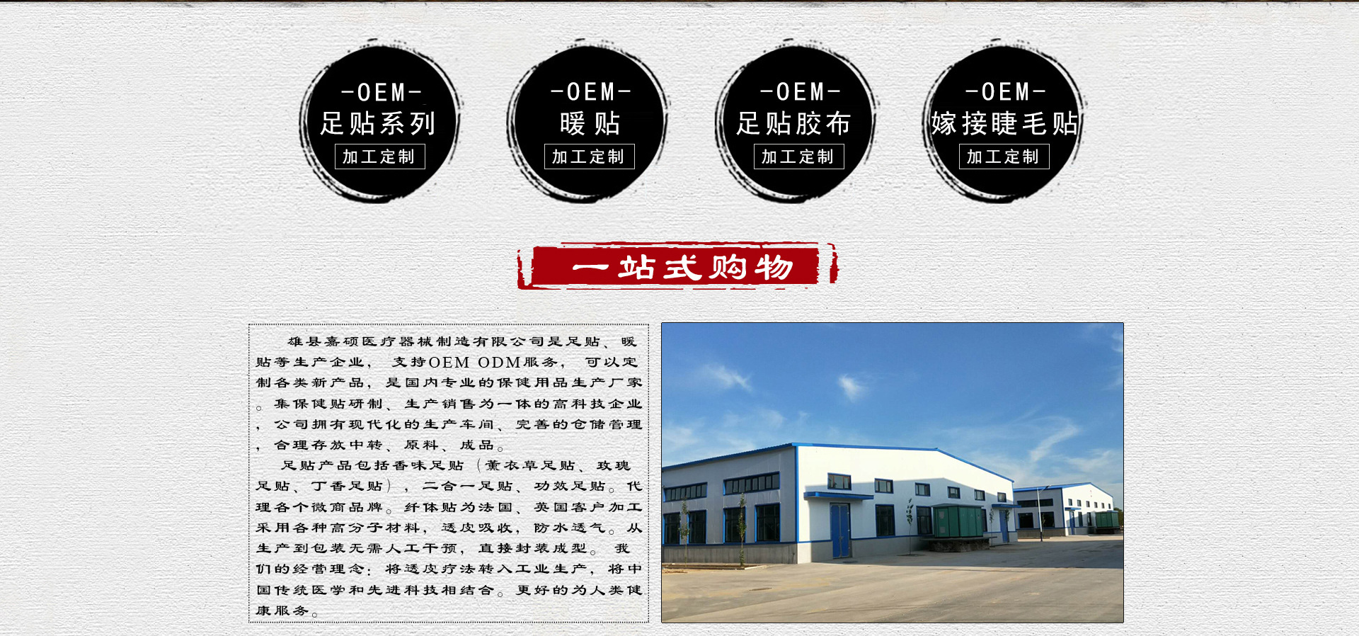 雄縣嘉碩醫(yī)療器械制造有限公司是足貼、暖貼等生產(chǎn)企業(yè), 日產(chǎn)30萬(wàn)貼。 支持OEM ODM服務(wù), 可以定制各類新產(chǎn)品,是國(guó)內(nèi)專業(yè)的保健用品生產(chǎn)廠家。集保健貼研制、生產(chǎn)銷售為一體的高科技企業(yè),公司擁有現(xiàn)代化的生產(chǎn)車間、完善的倉(cāng)儲(chǔ)管理,合理存放中轉(zhuǎn)、原料、成品。 足貼產(chǎn)品包括香味足貼(薰衣草足貼、玫瑰足貼、丁香足貼),二合一足貼、功效足貼。代理各個(gè)微商品牌。纖體貼為法國(guó)、英國(guó)客戶加工采用各種高分子材料,透皮吸收,防水透氣。從生產(chǎn)到包裝無(wú)需人工干預(yù),直接封裝成型。 我們的經(jīng)營(yíng)理念:將透皮療法轉(zhuǎn)入工業(yè)生產(chǎn),將中國(guó)傳統(tǒng)醫(yī)學(xué)和先進(jìn)科技相結(jié)合。更好的為人類健康服務(wù)。.等產(chǎn)品專業(yè)生產(chǎn)加工的公司,擁有完整、科學(xué)的質(zhì)量管理體系。雄縣嘉碩醫(yī)療器械制造有限公司的誠(chéng)信、實(shí)力和產(chǎn)品質(zhì)量獲得業(yè)界的認(rèn)可。歡迎各界朋友蒞臨參觀、指導(dǎo)和業(yè)務(wù)洽談。
