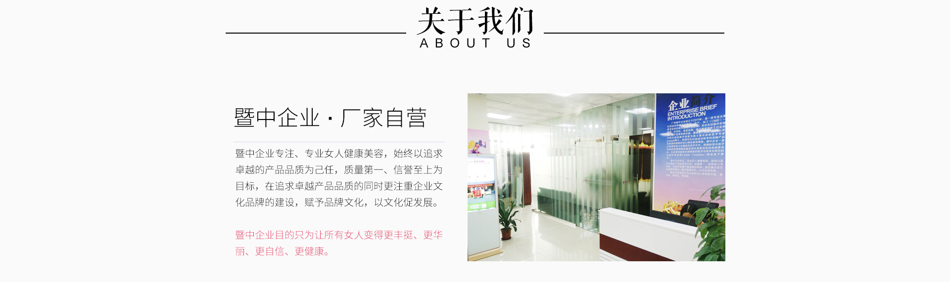 廣州暨中集團成立于2011年,是一家專業(yè)從事化妝品和保健品的研發(fā)、生產(chǎn)(ODM、OEM)、銷售一條龍業(yè)務的高科技現(xiàn)代化企業(yè)。其業(yè)務范圍涉足化妝品、美容連鎖、電子商務等多個行業(yè)領域。旗下品牌有馨瑤堂、yaoliyuan、納夫迪等。其中胸部品牌開創(chuàng)者為瑞士著名皮膚醫(yī)學專家Joseph博士,他用畢生心血成功研發(fā)的護胸產(chǎn)品在歐洲有著極好的口碑且備受贊譽。暨中集團一直以來秉承其文化精髓及技術升華,將國際頂尖醫(yī)學專家的智慧細胞結晶應用在貴族女性的美麗事業(yè)中,在這里有備受全球贊譽的醫(yī)學專家多年研究的尖端科技成果Caniar Complex(鱘魚魚子精華)。 暨中集團專注、專業(yè)女人健康美容,始終以追求卓越的產(chǎn)品品質(zhì)為己任,質(zhì)量第一、信譽至上為目標,在追求卓越產(chǎn)品品質(zhì)的同時,更注重企業(yè)文化品牌的建設,賦予品牌文化,以文化促發(fā)展。 暨中集團的目標是讓所有女人變得更豐挺、更華麗、更自信、更健康