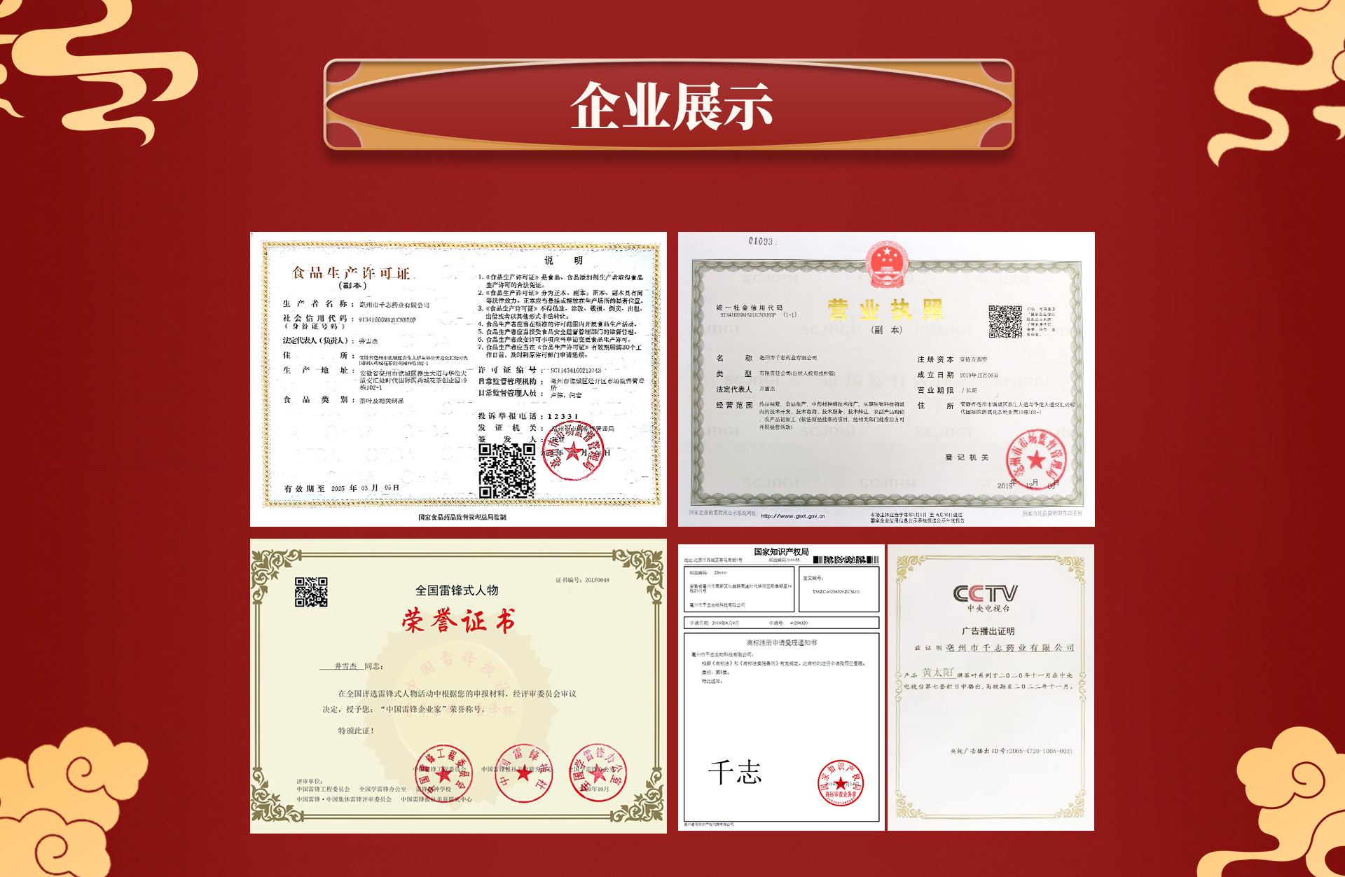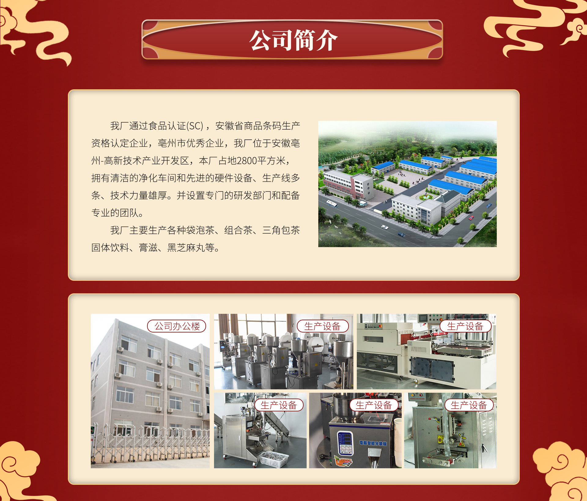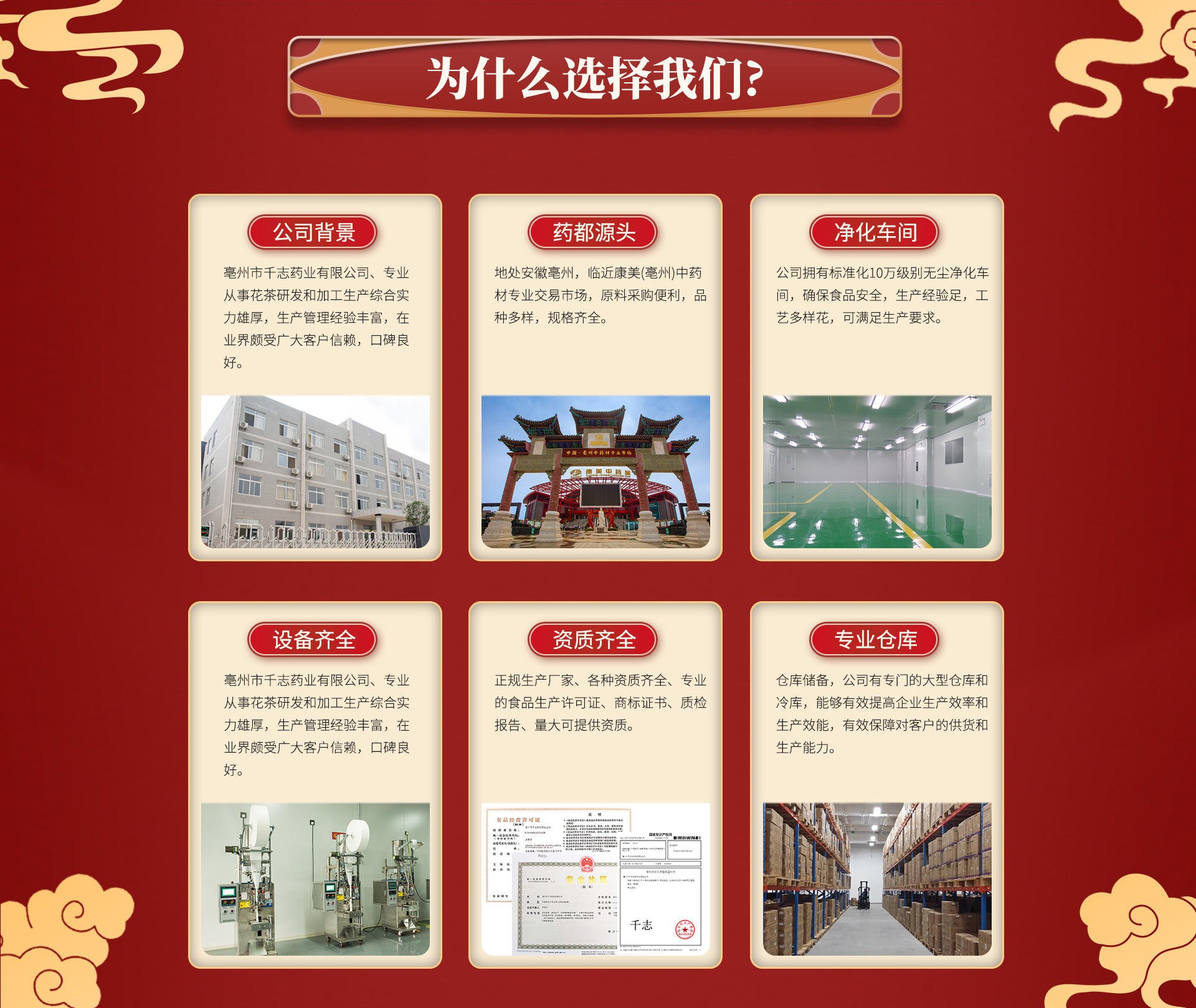 亳州市千志藥業(yè)有限公司坐落于安徽亳州譙城區(qū),成立于2019年,本公司是一家致力于集科研開發(fā)、產(chǎn)品生產(chǎn)、物流配送、市場銷售為一體的,服務(wù)于全國客戶的公司。 公司主要經(jīng)營范圍為:代用茶、含茶制品、固體飲料、方便食品、日化產(chǎn)品生產(chǎn)銷售等其他相關(guān)食品的生產(chǎn)銷售。