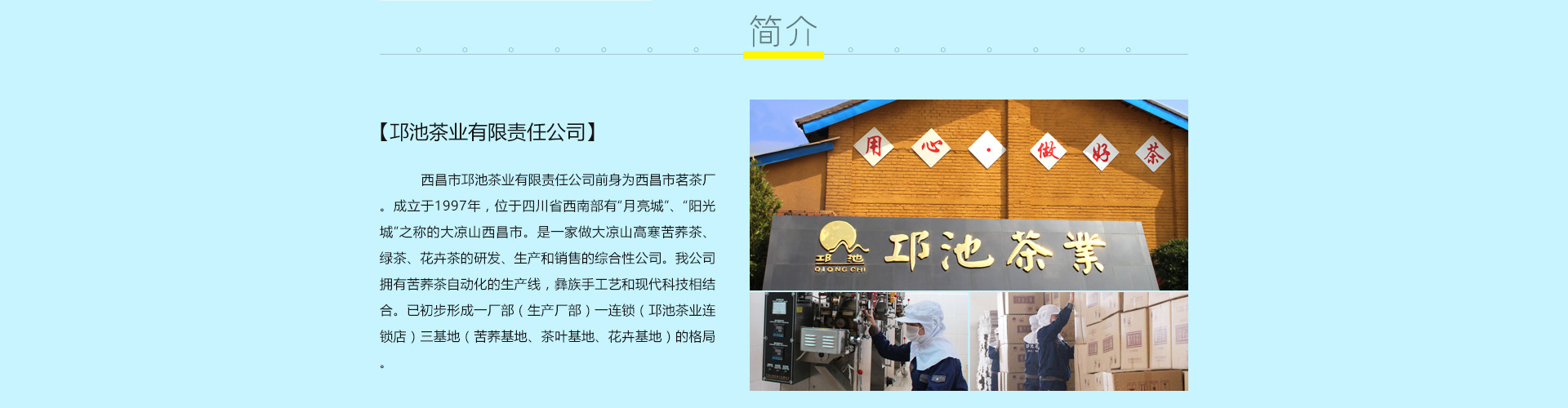 西昌市邛池茶業(yè)有限責(zé)任公司前身為西昌市茗茶廠。成立于2005年,位于四川省西南部有“月亮城”、“陽光城”之稱的大涼山西昌市。是一家專注于大涼山高寒優(yōu)質(zhì)苦蕎茶、生態(tài)綠茶、花卉茶的研發(fā)、生產(chǎn)和銷售的綜合性公司。