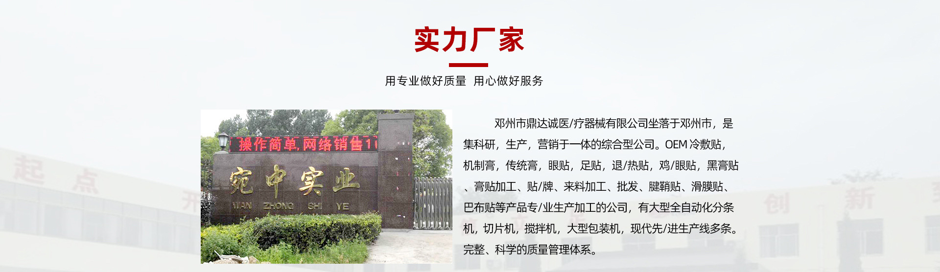 鎮(zhèn)平縣鼎達誠醫(yī)療器械有限公司坐落于鎮(zhèn)平縣工業(yè)園區(qū),是專業(yè)從事醫(yī)療器械的集科研,生產(chǎn),營銷于一體的綜合型醫(yī)藥公司。OEM 醫(yī)用冷敷貼,機制膏藥,傳統(tǒng)膏藥,眼貼,足貼,退熱貼,雞眼貼,手工膏藥貼 乳膏。黑膏藥、膏藥加工、膏藥貼牌、來料加工、膏藥批發(fā)、腱鞘貼、滑膜貼、脈管炎貼、減肥貼、止痛貼,巴布貼等產(chǎn)品專業(yè)生產(chǎn)加工的公司,擁有大型全自動化分條機,切片機,攪拌機,大型包裝機,現(xiàn)代先進生產(chǎn)線多條。完整、科學(xué)的質(zhì)量管理體系。鄧州市鼎達誠醫(yī)療器械有限公司的誠信、實力和產(chǎn)品質(zhì)量獲得業(yè)界的認可。歡迎各界朋友蒞臨參觀、指導(dǎo)和業(yè)務(wù)洽談。 我們堅持,以人為本,公平競爭,的現(xiàn)代企業(yè)制度,不斷加強內(nèi)部資源的整合,管理,充分運用資本運營,不斷提高企業(yè)的創(chuàng)新能力,為社會提供最優(yōu)良的產(chǎn)品。真誠歡迎國內(nèi)外有識之士來公司實地考察,在資金,技術(shù),設(shè)備,銷售等方面進行合作,互惠互利,實現(xiàn)雙贏
