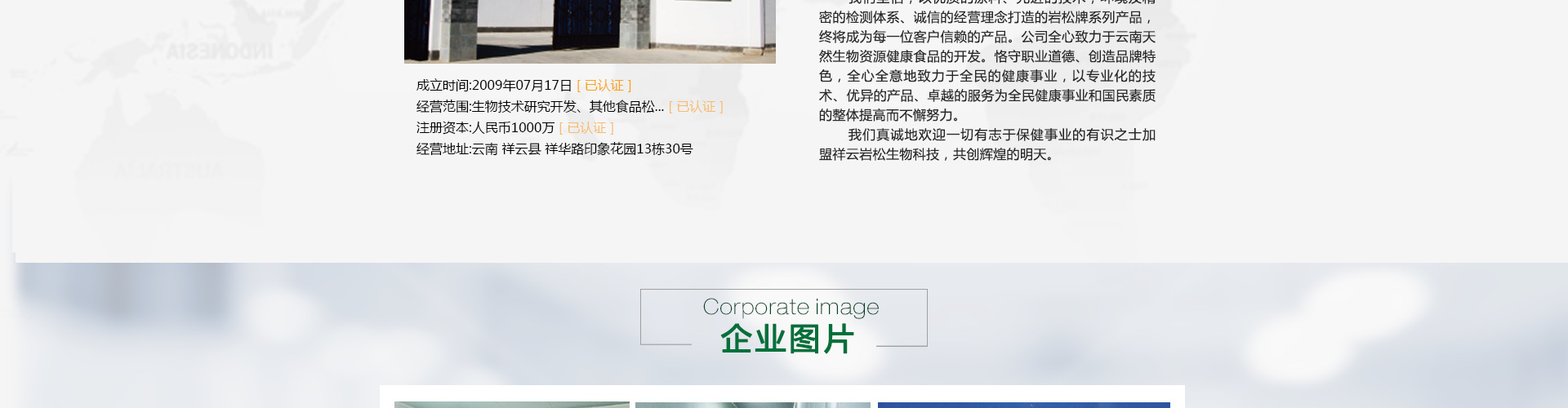 祥云巖松生物科技有限公司于2009年成立,注冊資金壹仟萬元,坐落于云南之源,彩云之鄉(xiāng)——美麗的大理祥云。擁有車間面積2326平米,三萬畝生態(tài)林基地。云南高原具有獨特的立體氣候,造就了無污染、原生態(tài)的綠色資源。公司充分發(fā)揮當(dāng)?shù)睾0卧?700~3500米高的自然優(yōu)勢,在松花粉原料采摘加工、瑪卡、辣木種植加工方面擁有不可比擬的專業(yè)優(yōu)勢, 經(jīng)先進的生物技術(shù)在萬級潔凈車間里精制而成。為廣大消費者提供安全、綠色的高品質(zhì)養(yǎng)生營養(yǎng)食品—松花粉、螺旋藻、瑪咖、辣木等系列產(chǎn)品。 我們堅信,以優(yōu)質(zhì)的原料、先進的技術(shù),環(huán)境及精密的檢測體系、誠信的經(jīng)營理念打造的巖松牌系列產(chǎn)品,終將成為每一位客戶信賴的產(chǎn)品。 公司全心致力于云南天然生物資源健康食品的開發(fā)。恪守職業(yè)道德、創(chuàng)造品牌特色,全心全意地致力于全民的健康事業(yè),以專業(yè)化的技術(shù)、優(yōu)異的產(chǎn)品、卓越的服務(wù)為全民健康事業(yè)和國民素質(zhì)的整體提高而不懈努力。