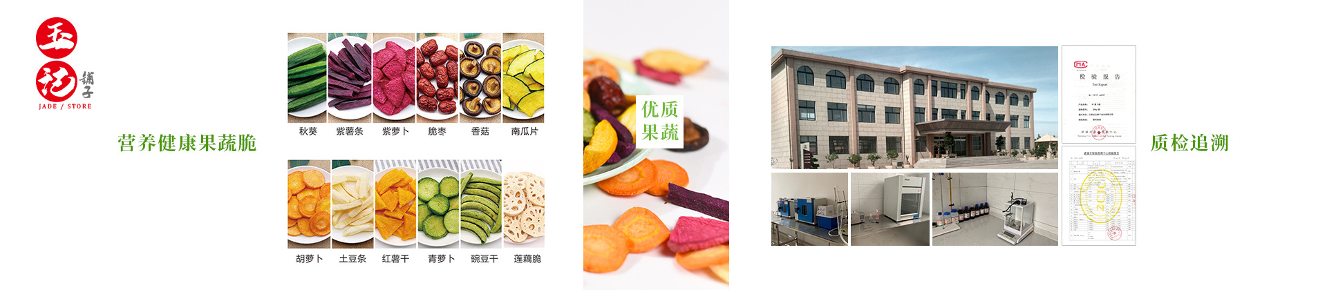 日照玉記鋪?zhàn)邮称酚邢薰緦I(yè)從事VF(真空低溫脫水)食品加工產(chǎn)業(yè),自有100多畝大型工業(yè)園區(qū),擁有先進(jìn)的VF設(shè)備生產(chǎn)線,在原有果蔬脆系列產(chǎn)品基礎(chǔ)上,研發(fā)出系列化的菌菇脆、海鮮脆等眾多新品種,積極倡導(dǎo)加工健康食品。 果蔬脆系列:精選新鮮蔬菜和水果,利用精湛的VF(真空低溫脫水)技術(shù),鎖住蔬菜、水果本味及營(yíng)養(yǎng),留住一日天然所需,VF技術(shù)可保持原蔬果95%以上的營(yíng)養(yǎng)成分,營(yíng)養(yǎng)流失甚少,不論視覺還是口感和味道上,都非常優(yōu)秀。果蔬脆片產(chǎn)品嚴(yán)格區(qū)別于薯片等油炸膨化食品,生產(chǎn)工藝流程無(wú)膨化過(guò)程,不添加人工色素,做出的果蔬脆帶著天然清新的果蔬原味,夾著酥脆的口感,是天然、營(yíng)養(yǎng)、健康的即食果蔬。 海鮮脆系列:公司全新一代VF海鮮脆產(chǎn)品,原料挑選自深海鮮活海產(chǎn)品,VF海鮮脆產(chǎn)品嚴(yán)格區(qū)別于傳統(tǒng)的海鮮干制品,生產(chǎn)過(guò)程不需要膨化、高溫油炸、無(wú)高溫烘烤等,不添加人工色素、含鹽量低,易咀嚼好消化