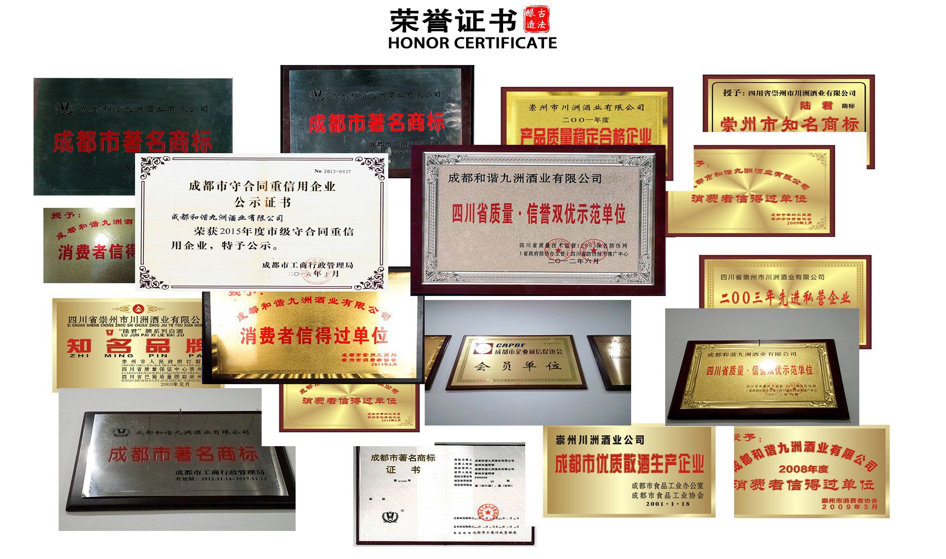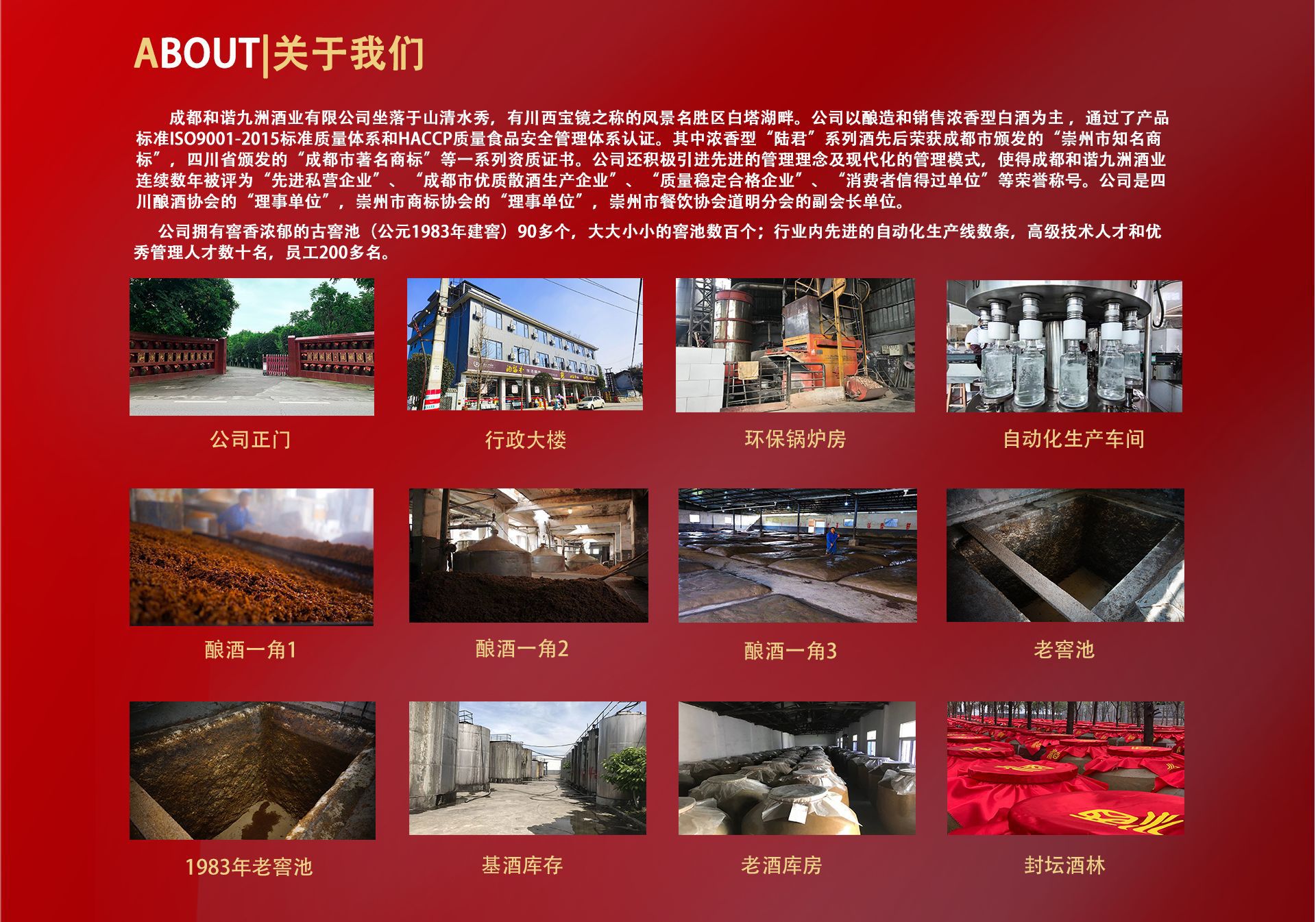 成都和諧九洲酒業(yè)有限公司座落在山清水秀,有川西寶鏡之稱的風(fēng)景名勝區(qū)白塔湖畔,氣候適宜,水源優(yōu)質(zhì),自然環(huán)境得天獨(dú)厚,公司始建于1984年,原為政府籌資的道明玉光春酒廠,后歷經(jīng)幾次機(jī)構(gòu)改制,于1999年5月變更為現(xiàn)在的民營股份制有限公司---成都和諧九洲酒業(yè)有限公司。 公司擁有歷史久遠(yuǎn)的古窖池160個(gè),在建窖池100多個(gè);具有國內(nèi)先進(jìn)水平的自動化生產(chǎn)線3條;白酒行業(yè)內(nèi)新的水處理設(shè)備2套、先進(jìn)的燭臺式過濾機(jī)2臺;行業(yè)專用粉碎機(jī)2臺;專業(yè)酒泵9臺;特種設(shè)備(鍋爐)2臺;空氣壓縮機(jī)9臺;在職人數(shù)達(dá)200余人,其中勾兌師1人,勾兌員2名,中級檢測人員1名,管理人才數(shù)十名。公司現(xiàn)有固定資產(chǎn)5000余萬元,年生產(chǎn)能力1萬余噸,日組裝能力達(dá)10000件(500ml*6)以上,具備白酒各項(xiàng)指標(biāo)的獨(dú)立檢測能力。公司通過了GB/T19001—2008—ISO9001:2008標(biāo)準(zhǔn)質(zhì)量體系認(rèn)證