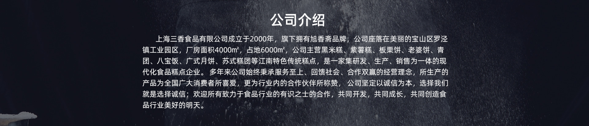 上海三香食品有限公司成立于2000年,座落在美麗的寶山區(qū)羅涇鎮(zhèn)工業(yè)園區(qū),總投資1500萬元人民幣,廠房面積4000㎡,占地6000㎡,公司主營黑米糕、紫薯糕、青團、八寶飯、廣式月餅、蘇式糕團等江南特色傳統(tǒng)糕點,是一家集研發(fā)、生產(chǎn)、銷售為一體的現(xiàn)代化專業(yè)食品糕點企業(yè)。 多年來公司始終秉承質(zhì)量第一、服務至上、回饋社會、合作雙贏的經(jīng)營理念,所生產(chǎn)的產(chǎn)品為全國廣大消費者所喜愛,尤其受年輕者追捧,更為行業(yè)內(nèi)的合作伙伴所稱贊,分別獲得3·15放心消費誠信會員單位、榮獲上海市寶山區(qū)食品生產(chǎn)企業(yè)聯(lián)合會誠信自律企業(yè)、會員單位,(全國)食品質(zhì)量打假保真聯(lián)盟單位等。 公司堅定以誠信為本,選擇我們就是選擇誠信;分別與線下商超大潤發(fā)、聯(lián)華、華聯(lián)、華潤萬家、全家、羅森便利店、芭比饅頭,上海知名老字號百草味、功德林、沈大成、喬家柵,上海知名飯店上海老飯店、綠波廊、德興館等長期保持合作關系。