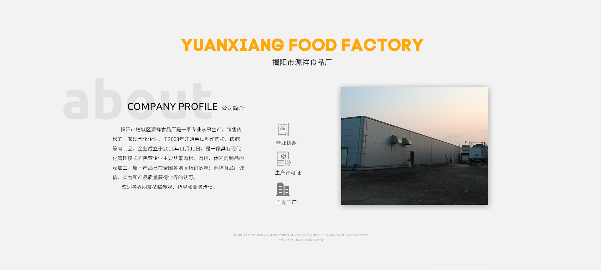 揭陽市榕城區(qū)源祥食品廠是一家專業(yè)從事生產(chǎn)、銷售肉松,肉松炒制工藝超過20年的源頭廠家,企業(yè)成立于2011年11月11日,是一家具有現(xiàn)代化管理模式的民營企業(yè)主要從事肉松、肉鋪、休閑肉制品的深加工!源祥食品廠誠信、實力和產(chǎn)品質(zhì)量獲得業(yè)界的認可。歡迎各界朋友蒞臨參觀、指導和業(yè)務洽談。
