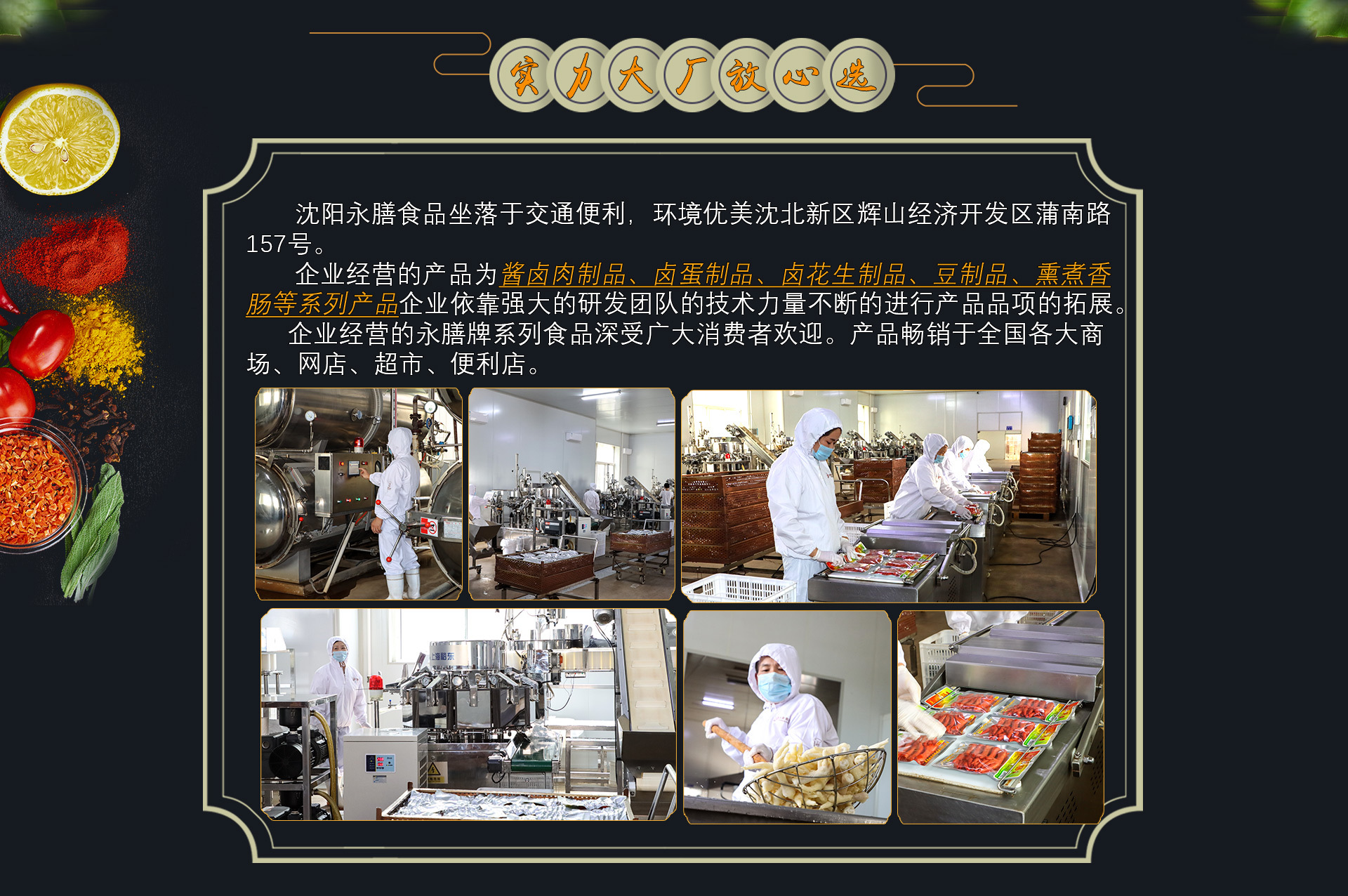 沈陽永膳食品坐落于交通便利,環(huán)境優(yōu)美沈北新區(qū)輝山經(jīng)濟(jì)開發(fā)區(qū)蒲南路157號。企業(yè)擁有大批行業(yè)技術(shù)專家和經(jīng)營專家組成,是一家專業(yè)從事鹵味食品研發(fā)、生產(chǎn)、銷售于一體的現(xiàn)代化企業(yè)。 企業(yè)經(jīng)營的產(chǎn)品為醬鹵肉制品、鹵蛋制品、鹵花生制品、豆制品、熏煮香腸等系列產(chǎn)品,企業(yè)依靠強(qiáng)大的研發(fā)團(tuán)隊(duì)的技術(shù)力量不斷的進(jìn)行產(chǎn)品品項(xiàng)的拓展。企業(yè)經(jīng)營的永膳牌系列食品深受廣大消費(fèi)者歡迎。產(chǎn)品暢銷于全國各大商場、超市、便利店。 企業(yè)依靠專業(yè)的銷售團(tuán)隊(duì)不斷的拓展市場進(jìn)而加強(qiáng)永膳食品的市場占有率和品牌知名度。