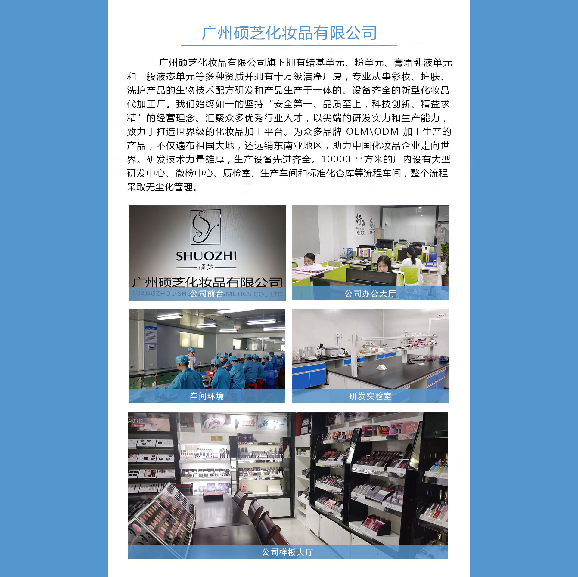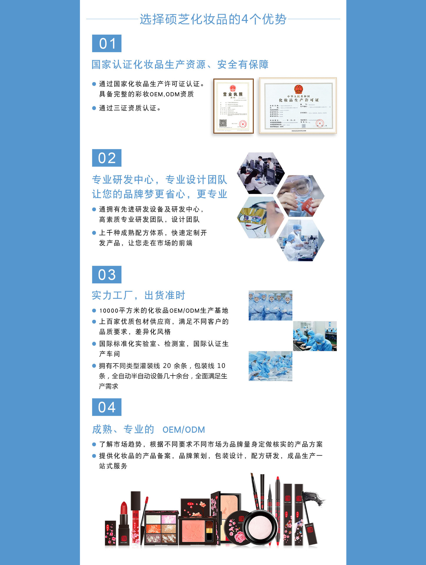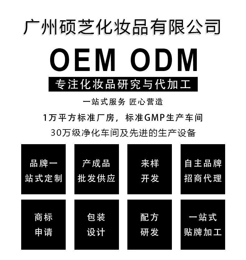 廣州碩芝化妝品有限公司是化妝品OEM/ODM、護膚彩妝等產(chǎn)品專業(yè)生產(chǎn)加工的公司,擁有完整、科學的質(zhì)量管理體系。廣州碩芝化妝品有限公司的誠信、實力和產(chǎn)品質(zhì)量獲得業(yè)界的認可。歡迎各界朋友蒞臨參觀、指導和業(yè)務洽談。
