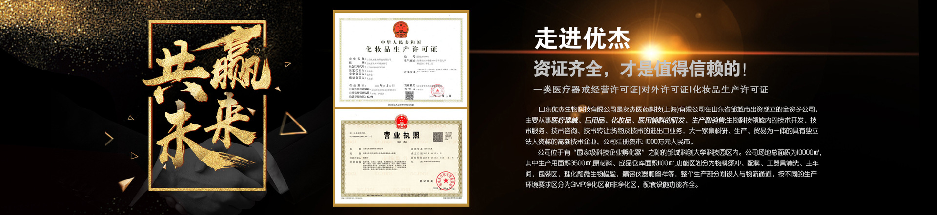 山東優(yōu)杰生物科技有限公司成立于2017年3月,專注于水凝膠創(chuàng)新產(chǎn)品的研發(fā)與生產(chǎn),目前已成為集研發(fā)、生產(chǎn)、銷售、進出口為一體的企業(yè),并致力于成為中國水凝膠產(chǎn)業(yè)的創(chuàng)新者與引領者。公司總面積10000㎡,擁有10萬級、30萬級潔凈廠房,具有醫(yī)療器械、化妝品、消毒產(chǎn)品、日用品等生產(chǎn)資質,專業(yè)生產(chǎn)水凝膠系列醫(yī)用貼劑、化妝品、醫(yī)美產(chǎn)品、日用品等,擁有12條自動生產(chǎn)線,日生產(chǎn)能力達40萬片(凝膠貼膜)+40萬瓶(凝膠)。 公司定位為“水凝膠創(chuàng)新產(chǎn)品專家”,由業(yè)內(nèi)知名專家?guī)ьI的研發(fā)團隊,擁有多項核心專利,并與山東中醫(yī)藥大學合作共建中藥凝膠貼劑產(chǎn)學研基地,與山東生命科技研究院共建創(chuàng)傷修復技術平臺,與瑞士LONZA合作凝膠身體貼膜聯(lián)合實驗室,與上海冠英生物共建水凝膠中試基地。