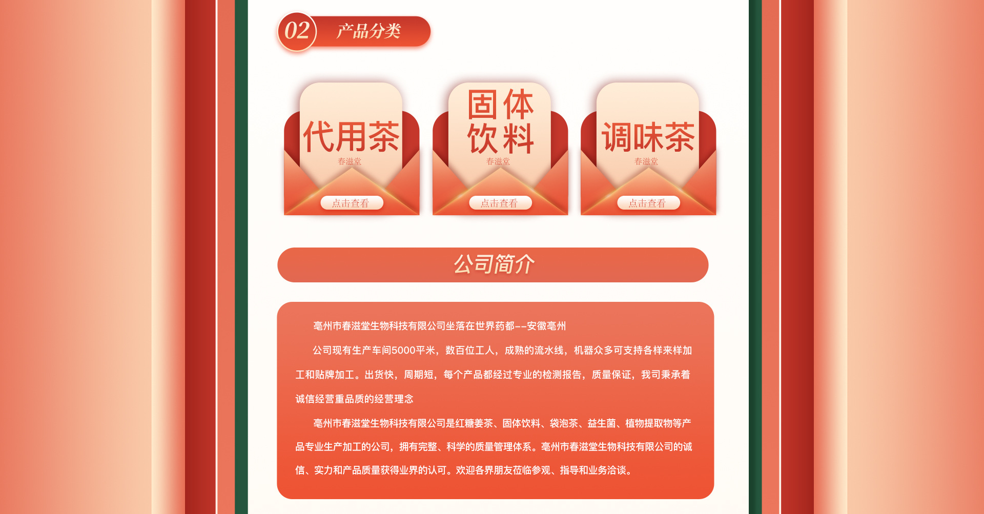 亳州市春滋堂生物科技有限公司是紅糖姜茶、固體飲料、袋泡茶、益生菌、植物提取物等產(chǎn)品專業(yè)生產(chǎn)加工的公司,擁有完整、科學(xué)的質(zhì)量管理體系。亳州市春滋堂生物科技有限公司的誠(chéng)信、實(shí)力和產(chǎn)品質(zhì)量獲得業(yè)界的認(rèn)可。歡迎各界朋友蒞臨參觀、指導(dǎo)和業(yè)務(wù)洽談。