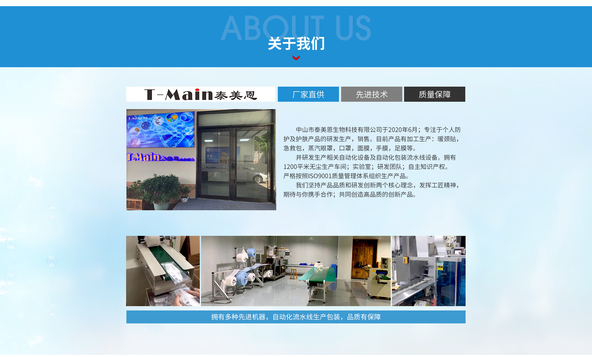 中山市泰美恩生物科技有限公司是口罩、手膜足膜、3D面膜、蒸汽眼罩、熱敷貼等產(chǎn)品專業(yè)生產(chǎn)加工的公司,擁有完整、科學(xué)的質(zhì)量管理體系。中山市泰美恩生物科技有限公司的誠(chéng)信、實(shí)力和產(chǎn)品質(zhì)量獲得業(yè)界的認(rèn)可。歡迎各界朋友蒞臨參觀、指導(dǎo)和業(yè)務(wù)洽談。