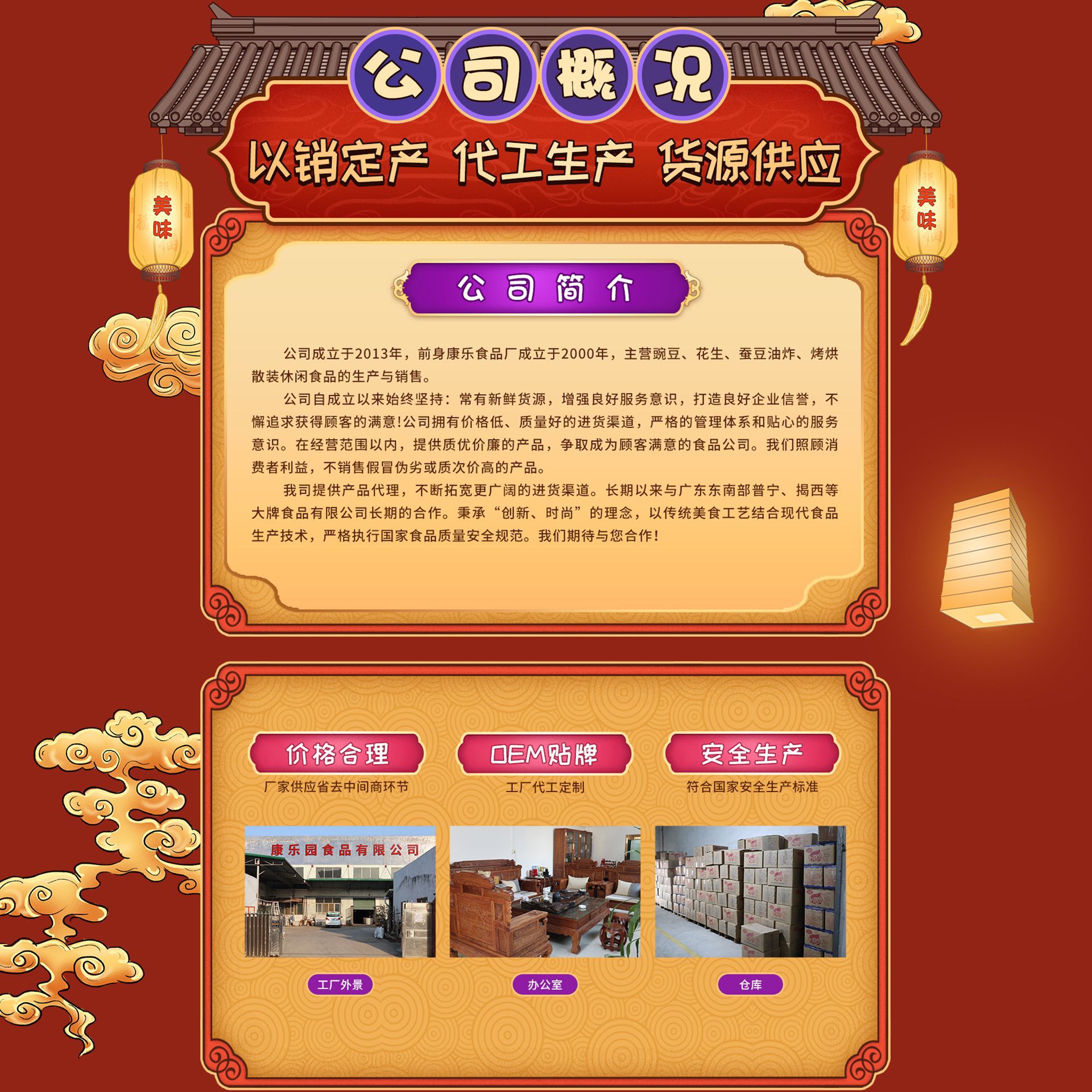肇慶市鼎湖區(qū)康樂園食品有限公司位于廣東省中部偏西,陸路距廣州70公里,水路距香港120海里,交通十分便利,已建設(shè)成為粵港澳大灣區(qū)面向大西南樞紐門戶城市,公司成立于2013年,前身康樂食品廠成立于2000年,主營豌豆、花生、蠶豆油炸、烤烘散裝休閑食品的生產(chǎn)與銷售。 公司自成立以來,始終堅(jiān)定統(tǒng)一信念:時(shí)刻保證新鮮貨源,增強(qiáng)一流服務(wù)意識(shí),打造良好企業(yè)信譽(yù),不懈追求顧客的滿意!公司擁有價(jià)格更低、質(zhì)量更好的進(jìn)貨渠道,嚴(yán)格的管理體系和很強(qiáng)的服務(wù)理念。在經(jīng)營范圍以內(nèi),堅(jiān)決提供質(zhì)優(yōu)價(jià)廉的產(chǎn)品,精心打造顧客滿意品牌。公司始終堅(jiān)持消費(fèi)者利益高于一切,堅(jiān)決杜絕假冒偽劣或質(zhì)次價(jià)高的產(chǎn)品。 康樂園食品有限公司成立至今就一貫致力于提供物美價(jià)廉的產(chǎn)品的代理,致力于拓寬更廣闊優(yōu)質(zhì)貨源的進(jìn)貨渠道,致力于打造客戶滿意、放心的品牌企業(yè)。公司主營各種各種豌豆、花生、蠶豆油炸、烘烤系列休閑食品,長(zhǎng)期以來與廣東東南部普