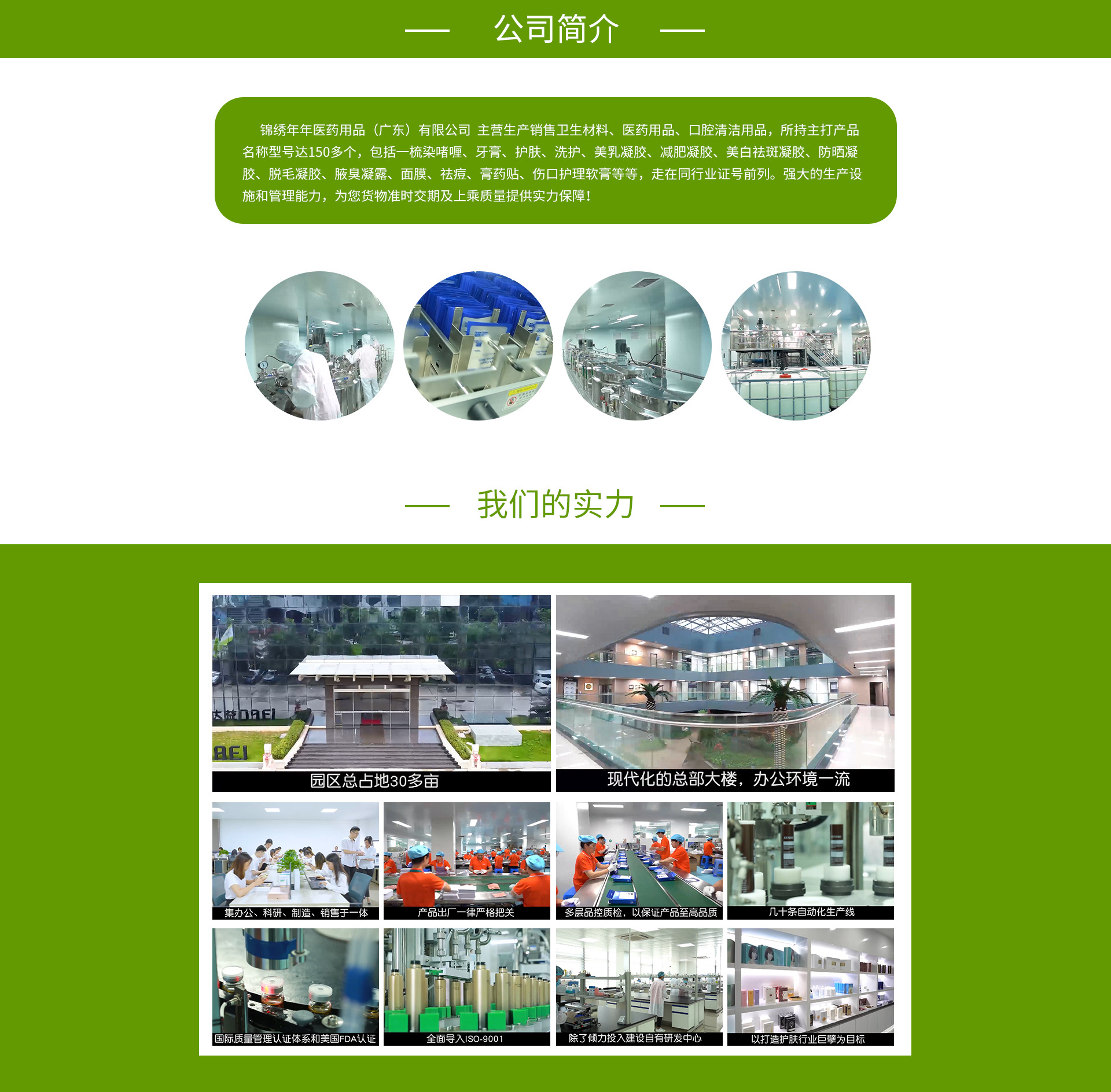 生產(chǎn)銷售衛(wèi)生材料、醫(yī)藥用品、口腔清潔用品,主打產(chǎn)品名稱型號達150多個,包括一梳染啫喱、一支染啫喱、口腔護理牙膏、護膚凝膠、洗護凝膠、美乳凝膠、減肥凝膠、美白祛斑凝膠、防曬凝膠、脫毛凝膠、祛痘凝膠、醫(yī)用冷敷貼、穴位壓力刺激貼、傷口護理軟膏、醫(yī)用冷敷眼罩、醫(yī)用隔離面罩、醫(yī)用退熱貼等等,走在同行業(yè)前列。強大的生產(chǎn)設(shè)施和管理能力,為您產(chǎn)品的準時交期及上乘質(zhì)量提供實力保障!