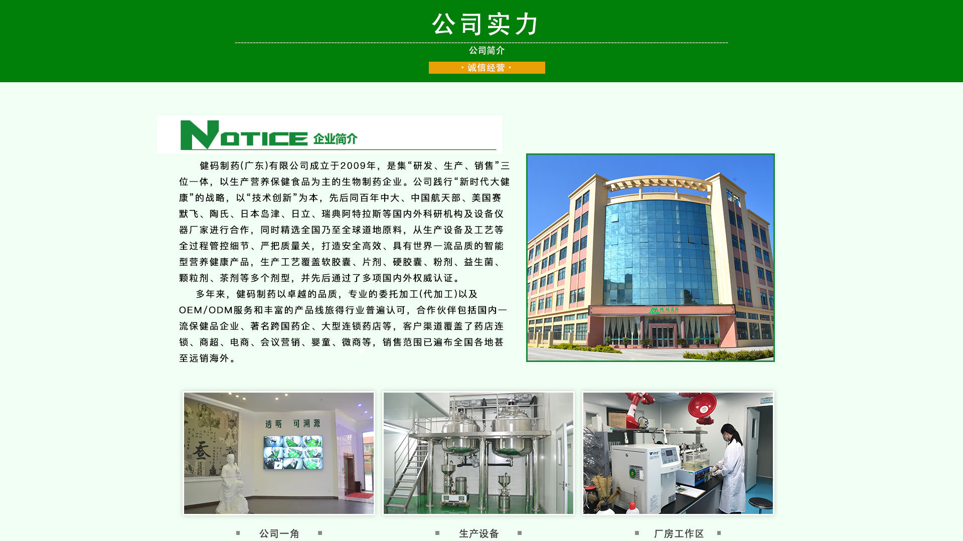 健碼制藥(廣東)有限公司,位于廣東省廣州市,成立于2009年,是一家集“研發(fā)、生產(chǎn)、銷售”三位一體,以生產(chǎn)營養(yǎng)保健食品為主的生物制藥企業(yè)。踐行“新時代大健康”的戰(zhàn)略,以“技術(shù)創(chuàng)新”為本,先后同百年中大、中國航天部、美國賽默飛、陶氏、日本島津、日立、瑞典阿特拉斯等國內(nèi)外科研機構(gòu)及設(shè)備儀器廠家進行合作,同時精選全國乃至全球道地原料,從生產(chǎn)設(shè)備及工藝等全過程管控細節(jié)、嚴把質(zhì)量關(guān),打造安全高效、具有一流卓越品質(zhì)的智能型營養(yǎng)健康產(chǎn)品,生產(chǎn)工藝覆蓋軟膠囊、片劑、硬膠囊、粉劑、益生菌、顆粒劑、 茶劑等多個劑型,并先后通過了多 項國內(nèi)外權(quán)威認證。