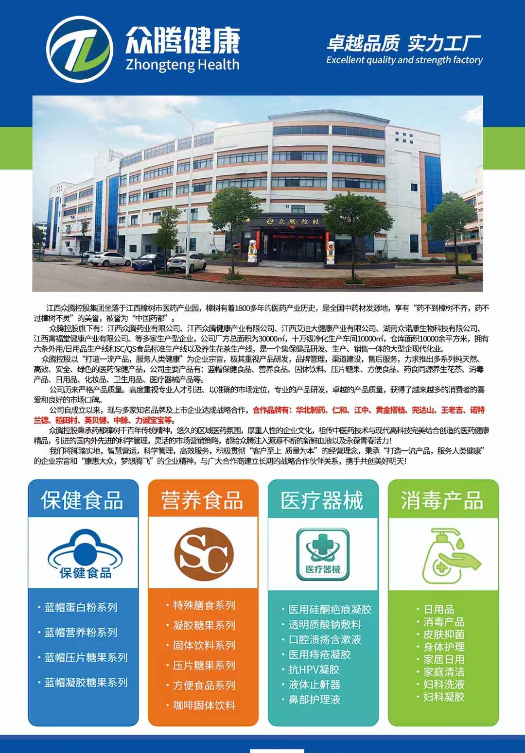 江西眾騰健康產(chǎn)業(yè)有限公司是食品、保健品、消毒用品、化妝品、原料等產(chǎn)品專業(yè)生產(chǎn)加工的公司,擁有完整、科學(xué)的質(zhì)量管理體系。江西眾騰健康產(chǎn)業(yè)有限公司的誠信、實(shí)力和產(chǎn)品質(zhì)量獲得業(yè)界的認(rèn)可。歡迎各界朋友蒞臨參觀、指導(dǎo)和業(yè)務(wù)洽談。