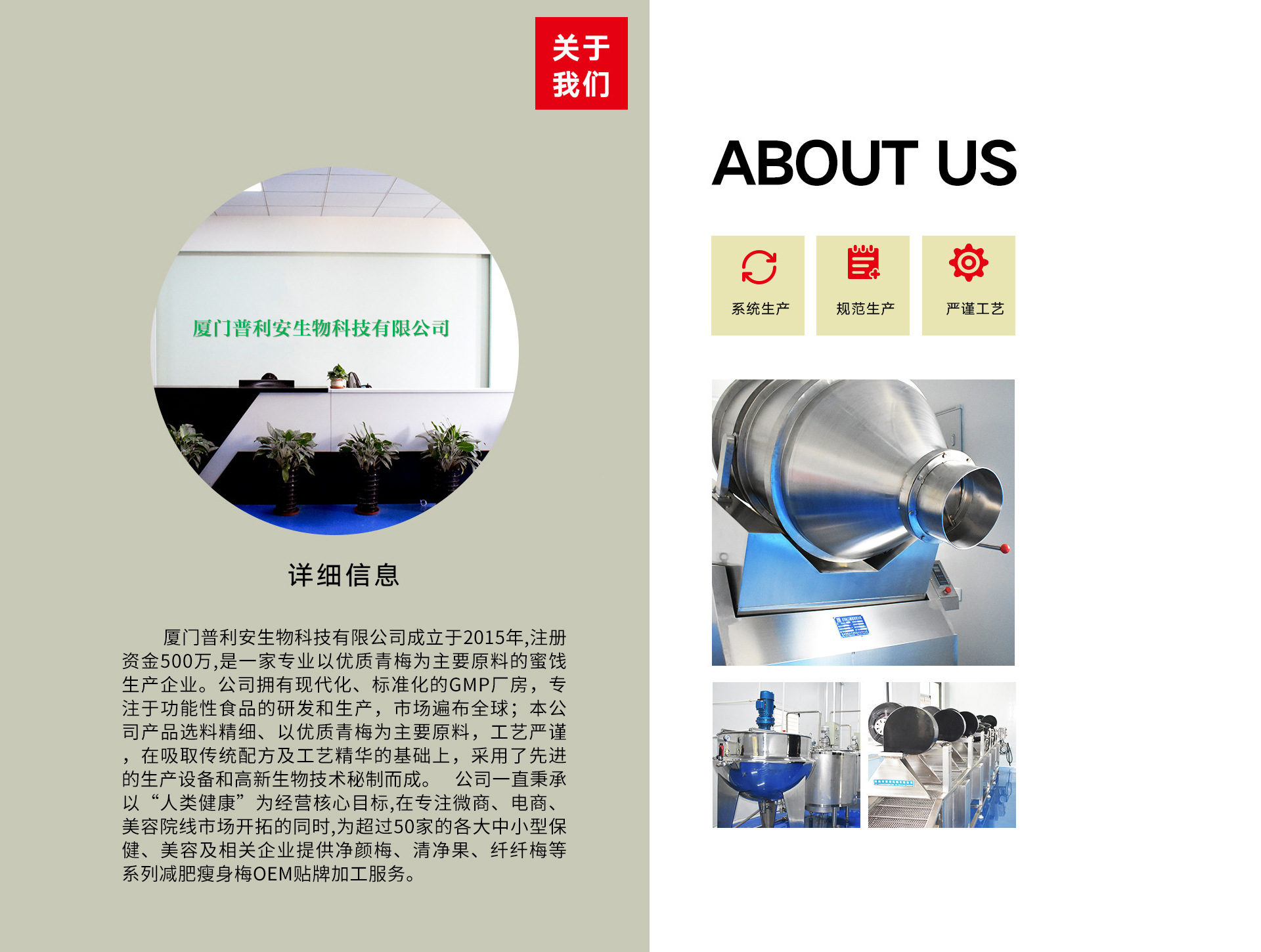 廈門普利安生物科技有限公司成立于2015年,注冊資金500萬,是一家專業(yè)以優(yōu)質(zhì)青梅為主要原料的蜜餞生產(chǎn)企業(yè)。公司擁有現(xiàn)代化、標(biāo)準(zhǔn)化的GMP廠房,借助現(xiàn)代高新生物技術(shù)和“以人為本”的理念,專注于功能性食品的研發(fā)和生產(chǎn),市場遍布全球;本公司產(chǎn)品選料精細(xì)、以優(yōu)質(zhì)青梅為主要原料,工藝嚴(yán)謹(jǐn),在吸取傳統(tǒng)配方及工藝精華的基礎(chǔ)上,采用了先進(jìn)的生產(chǎn)設(shè)備和高新生物技術(shù)秘制而成。 公司一直秉承以“人類健康”為經(jīng)營核心目標(biāo),在專注微商、電商、美容院線市場開拓的同時(shí),為超過50家的各大中小型保健、美容及相關(guān)企業(yè)提供凈顏梅、清凈果、纖纖梅等系列減肥瘦身梅OEM貼牌加工服務(wù)。憑借優(yōu)質(zhì)、用心的服務(wù)公司贏得了眾多合作企業(yè)的信賴和好評,在功能性梅子蜜餞加工領(lǐng)域逐漸樹立起公司良好品牌。公司不僅僅提供專業(yè)的OEM服務(wù)、咨詢,同時(shí)還擁有完善的品牌塑造經(jīng)驗(yàn)及相關(guān)服務(wù)體系,為合作企業(yè)發(fā)展中遇到的問題和困難提供指導(dǎo)幫助。我們相信,通過我們的不斷努力和追求,一定能夠?qū)崿F(xiàn)與合作伙伴的互利共贏!