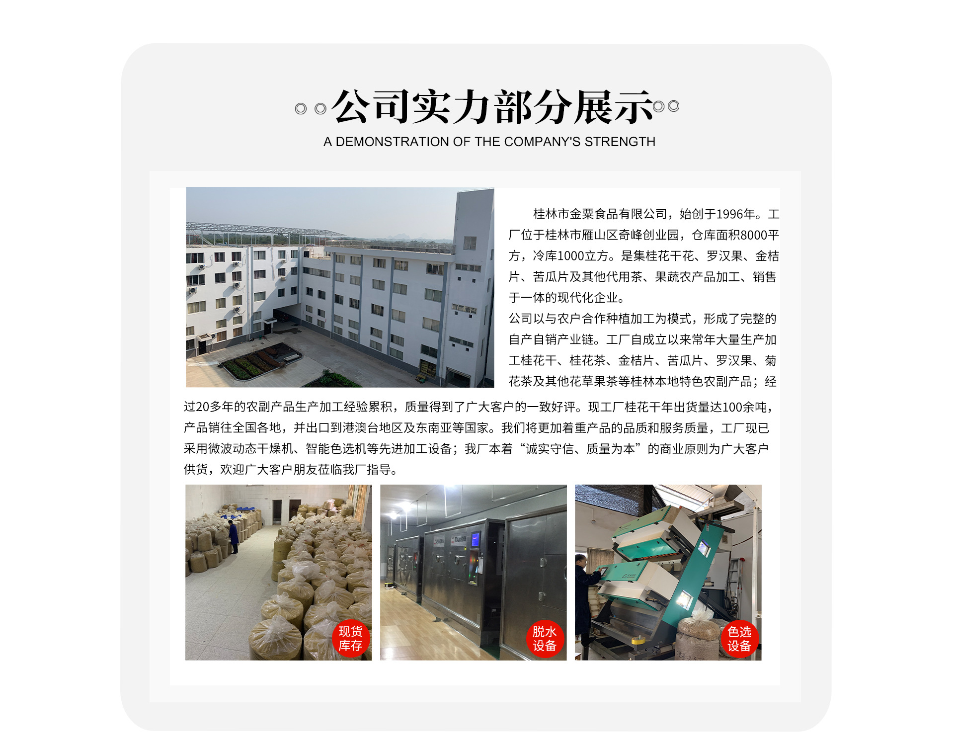 桂林市金粟食品有限公司始創(chuàng)于1996年,坐落于有“山水甲天下”之稱的國(guó)際旅游勝地——桂林,2018年進(jìn)駐廣西桂林市雁山區(qū)奇峰創(chuàng)業(yè)園,是一家專注于桂花產(chǎn)業(yè),集桂花干、桂花茶、桂花醬以及桂花周邊產(chǎn)品研發(fā)、生產(chǎn)、銷售于一體的現(xiàn)代化企業(yè)。 公司占地面積4000多平方米,擁有完整的代用茶、調(diào)味茶和水果干制品生產(chǎn)線,專業(yè)的生產(chǎn)加工車間、庫(kù)房,并采用先進(jìn)的色選機(jī)、微波真空脫水烘干設(shè)備,可為全球客戶提供ODM、OEM,我們年加工桂花干花100余噸,苦瓜干、羅漢果、金桔片及其他代用茶、水果干制品70余噸,我們長(zhǎng)期合作伙伴有國(guó)內(nèi)外著名食品、保健品、藥品企業(yè),依靠他們的支持,我們的產(chǎn)品行銷全國(guó),遠(yuǎn)銷東南亞國(guó)家、地區(qū)及歐美市場(chǎng)。 在農(nóng)業(yè)產(chǎn)業(yè)化大背景下,公司堅(jiān)持推動(dòng)桂花產(chǎn)業(yè)化升級(jí),提高產(chǎn)品產(chǎn)量的同時(shí),嚴(yán)格把控產(chǎn)品質(zhì)量關(guān),力爭(zhēng)在同行業(yè)里做到標(biāo)桿企業(yè)。公司始終秉持“誠(chéng)信為本、互利共贏”的經(jīng)營(yíng)理念,以客戶為中心,提供優(yōu)質(zhì)