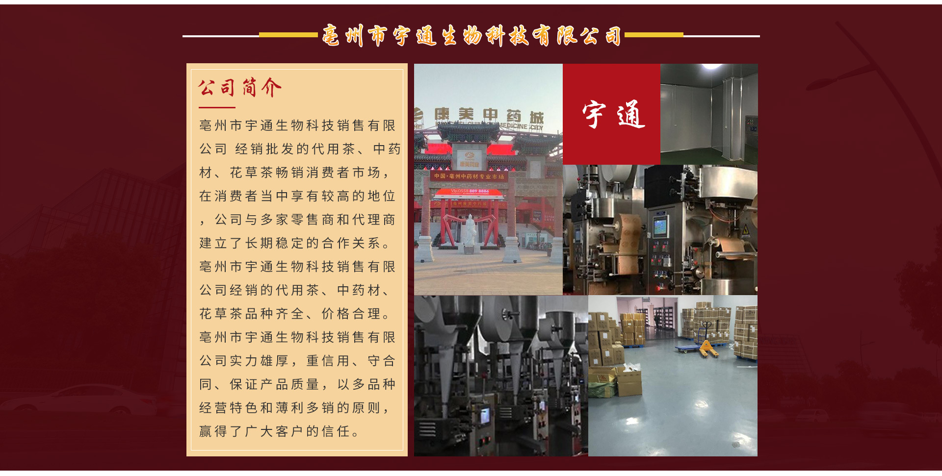 亳州市宇通生物科技有限公司坐落于藥都之鄉(xiāng).華佗故里,公司起源于2008年,新廠成立于2017年注冊資金200萬元整,公司占地3000平方米,總建筑面積3000平方米,其中生產(chǎn)團(tuán)隊91人,研發(fā)團(tuán)隊4人,銷售團(tuán)隊10人,后勤物資采購12人。亳州市宇通生物科技有限公司 是專業(yè)從事健康養(yǎng)生花茶,調(diào)味茶,固體飲料,壓片糖果,方便食品,固態(tài)調(diào)味研發(fā)生產(chǎn)銷售。致力于養(yǎng)生理念發(fā)掘并應(yīng)用各種純天然草本健康養(yǎng)生資源。期待與您合作,攜手共創(chuàng)輝煌。 我公司以質(zhì)量求生存,以誠信求發(fā)展,在全面的質(zhì)量控制下使產(chǎn)品質(zhì)量得到更有效的保障,合理的價格優(yōu)質(zhì)的產(chǎn)品,良好的服務(wù),是我們對客戶的承諾,歡迎各界朋友蒞臨參觀,指導(dǎo)和業(yè)務(wù)洽談..