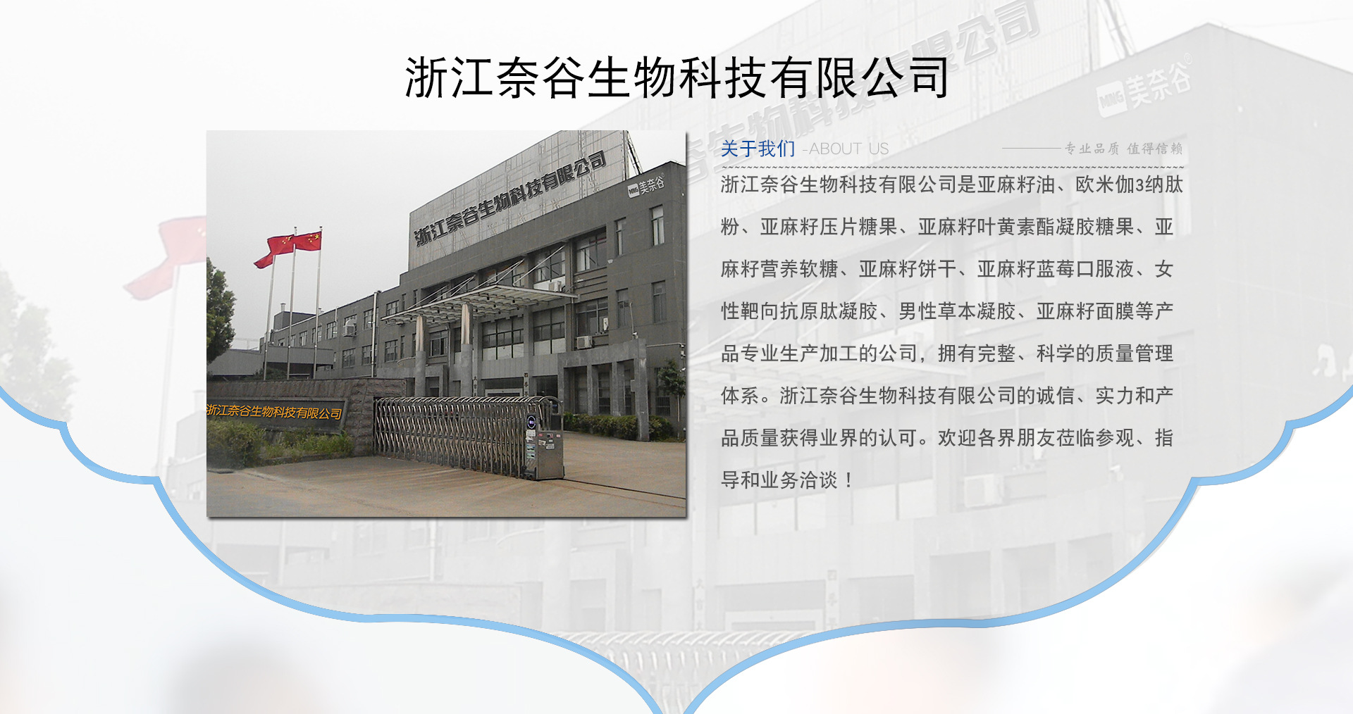 浙江奈谷生物科技有限公司是亞麻籽油、歐米伽3納肽粉、亞麻籽壓片糖果、亞麻籽葉黃素酯凝膠糖果、亞麻籽營養(yǎng)軟糖、亞麻籽餅干、亞麻籽藍(lán)莓口服液、女性靶向抗原肽凝膠、男性草本凝膠、亞麻籽面膜等產(chǎn)品專業(yè)生產(chǎn)加工的公司,擁有完整、科學(xué)的質(zhì)量管理體系。