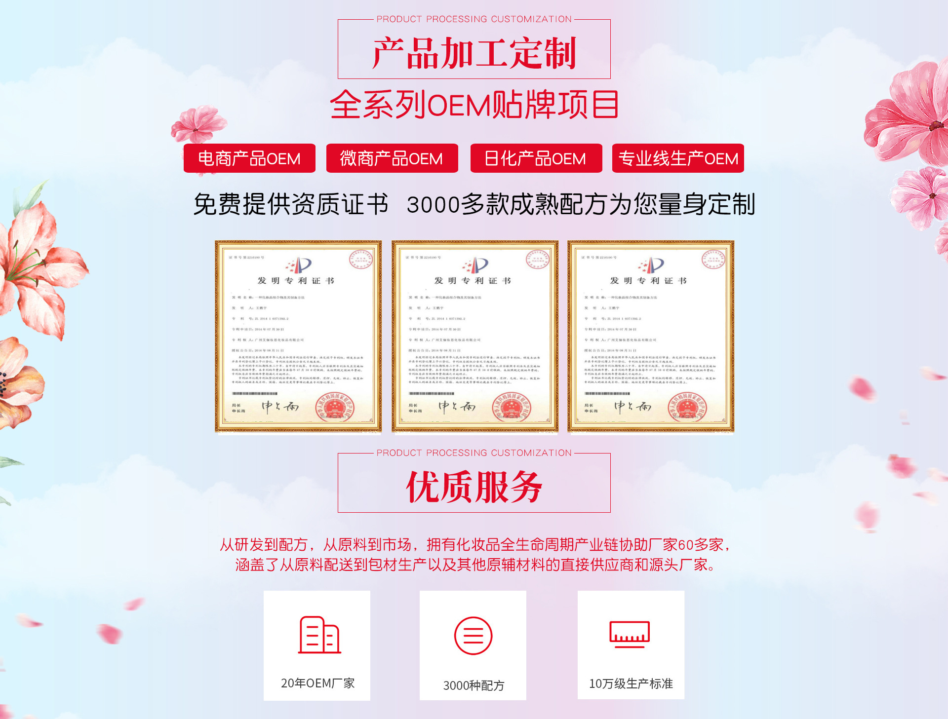 廣州艾儷妝思化妝品有限公司,成立于2008年,坐落于廣州白云區(qū)占地面積三千多平米。艾儷妝思化妝品是一家國際領(lǐng)先的化妝品品牌輸出基地,專為國際性化妝品品牌提供加工的平臺,為客戶提供個性化的OEM/ODM服務(wù)。涵蓋商標注冊、產(chǎn)品規(guī)劃、配方開發(fā)、包裝設(shè)計、功效測試、乳化、灌裝、包裝、倉儲物流等服務(wù),是一家集研發(fā)、生產(chǎn)及銷售策劃為一體的專業(yè)化妝品OEM/ODM加工服務(wù)企業(yè)。 廣州艾儷妝思化妝品有限公司始終秉承“創(chuàng)新、共贏”的核心價值觀,以“創(chuàng)造客戶市場價值,推動行業(yè)持續(xù)發(fā)展”為己任,堅持“質(zhì)量保證、服務(wù)為先、效率至上”的管理理念,提供“貼心、精心、耐心”的服務(wù),不斷進行技術(shù)創(chuàng)新,研發(fā)安全的高品質(zhì)產(chǎn)品,為客戶實現(xiàn)品牌價值和市場價值。 廣州艾儷妝思化妝品有限公司,作為有化妝品生產(chǎn)許可證的生產(chǎn)廠家,全流程為客戶提供蠶絲面膜、水乳膏霜、洗發(fā)沐浴露、精油系列等的代加工/貼牌服務(wù)。