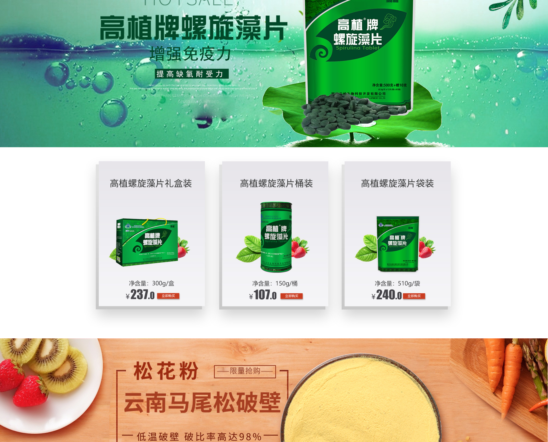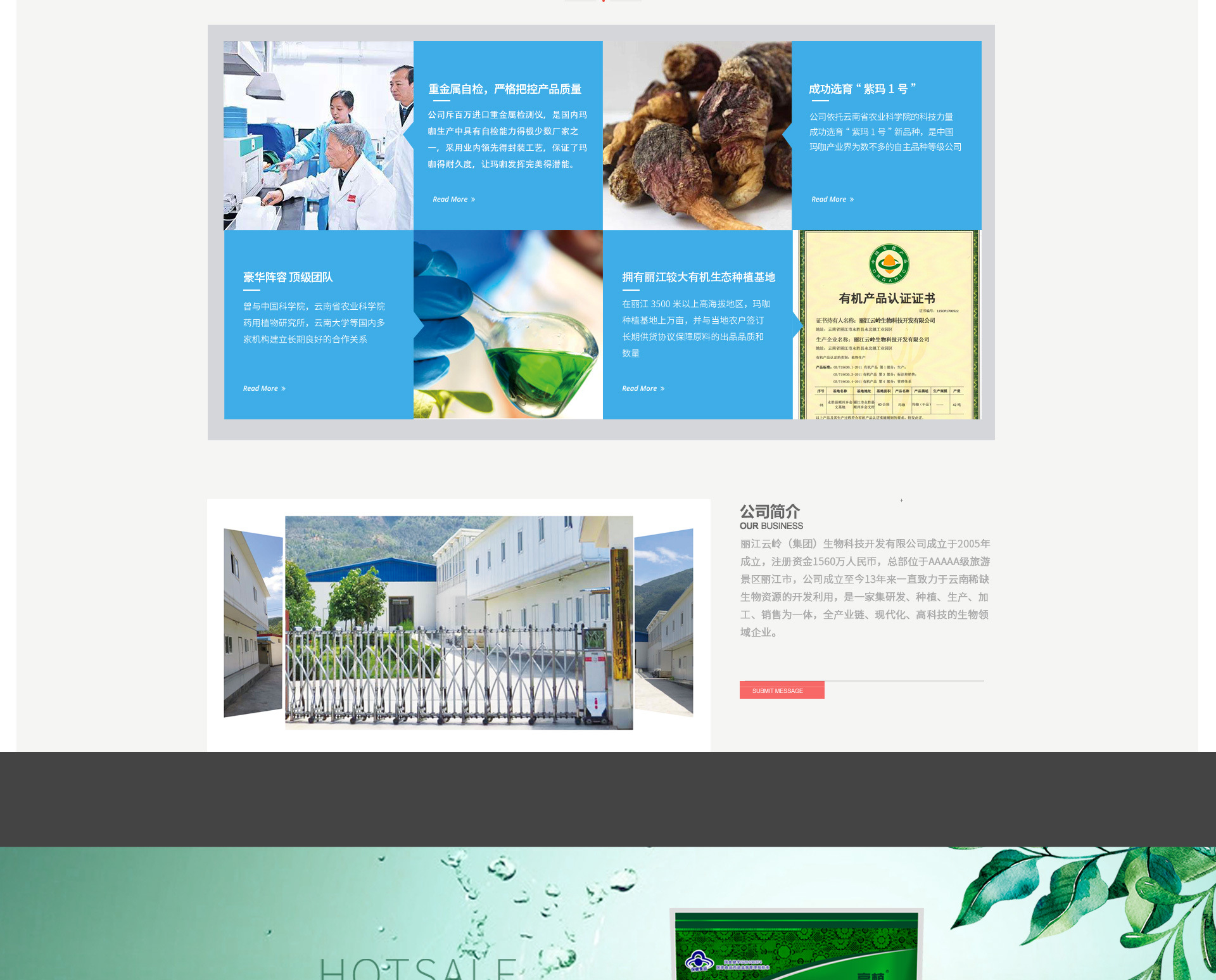 麗江云嶺生物科技開發(fā)有限公司成立于2005年,本公司主要從事麗江本土生物資源研發(fā)、加工與銷售,開發(fā)經(jīng)營(yíng)永勝螺旋藻、瑪咖、松花粉等。公司本著“依靠當(dāng)?shù)貎?yōu)勢(shì)資源,開發(fā)先進(jìn)生產(chǎn)技術(shù),整合吸收各方力量,嚴(yán)格管理、誠(chéng)信經(jīng)營(yíng)、不斷創(chuàng)新”的企業(yè)宗旨,努力成為最好的螺旋藻保健品供應(yīng)商。2007年,公司與云南省農(nóng)業(yè)科學(xué)院藥用植物研究所合作,推出了“高植”牌螺旋藻系列產(chǎn)品,在市場(chǎng)上獲得極高贊譽(yù)。公司于2009年,在永勝縣永北鎮(zhèn)工業(yè)園區(qū)投資1500萬(wàn)元,建立了完善的集開發(fā)、研究、加工、銷售為一體的程海螺旋藻及瑪咖產(chǎn)品開發(fā)基地。公司現(xiàn)擁有一條生產(chǎn)能力為年產(chǎn)200噸螺旋藻及片劑產(chǎn)品的生產(chǎn)線及其配套基礎(chǔ)設(shè)施,該生產(chǎn)線包括..