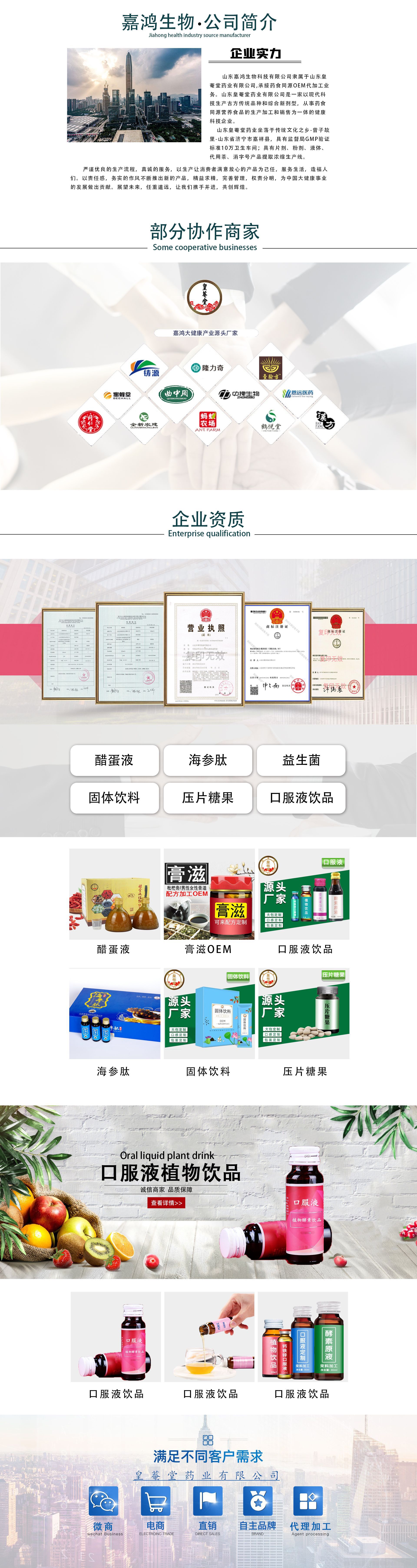 山東嘉鴻生物科技有限公司隸屬于山東皇菴堂藥業(yè)有限公司,承接藥食同源OEM貼牌代加工業(yè)務(wù)。是一家以現(xiàn)代科技生產(chǎn)綜合新劑型的公司,從事藥食同源營(yíng)養(yǎng)食品的生產(chǎn)加工和銷售為一體的健康科技企業(yè)。