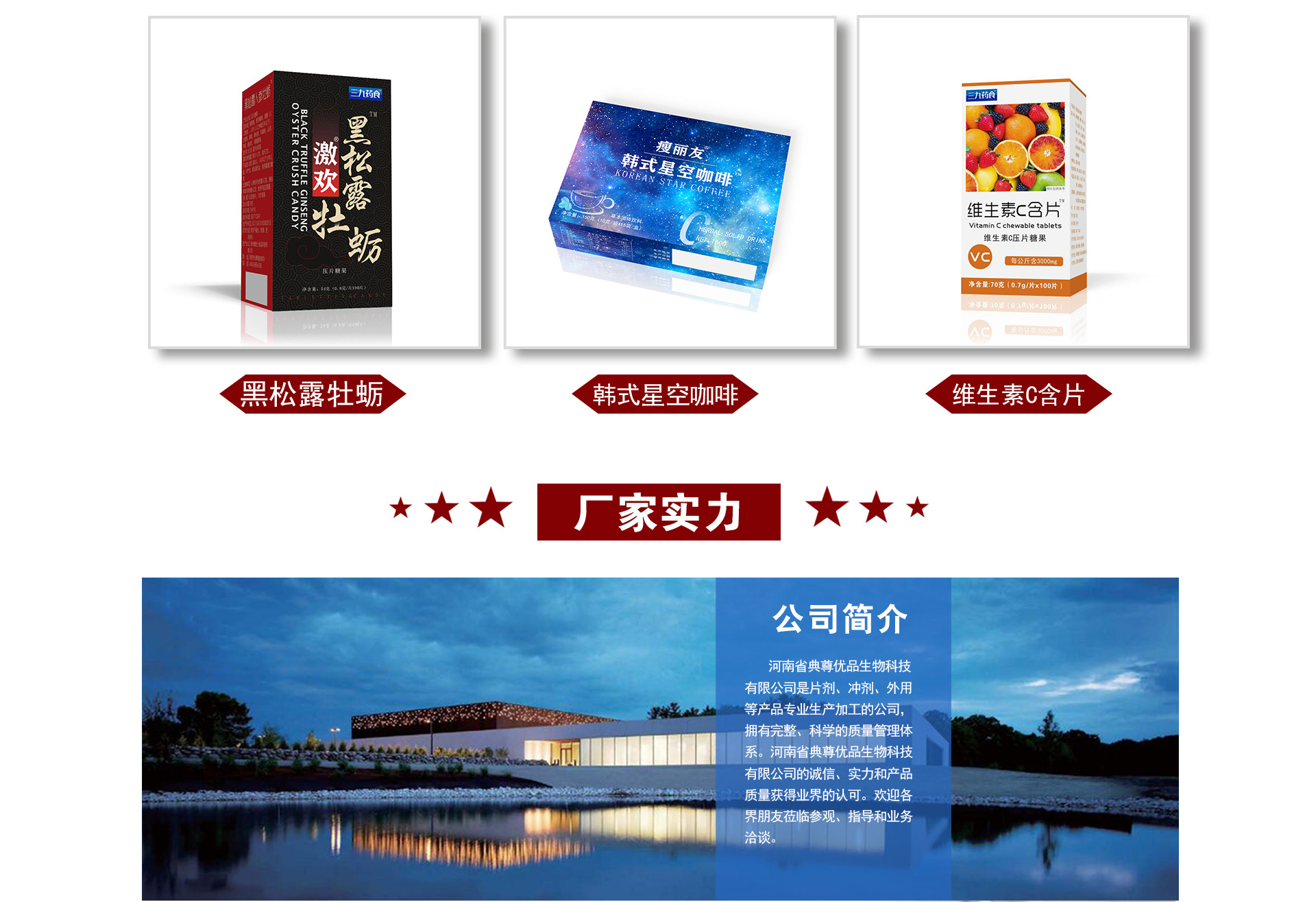 河南省典尊優(yōu)品生物科技有限公司是片劑、沖劑、外用等產(chǎn)品專業(yè)生產(chǎn)加工的公司,擁有完整、科學(xué)的質(zhì)量管理體系。河南省典尊優(yōu)品生物科技有限公司的誠信、實力和產(chǎn)品質(zhì)量獲得業(yè)界的認(rèn)可。歡迎各界朋友蒞臨參觀、指導(dǎo)和業(yè)務(wù)洽談。