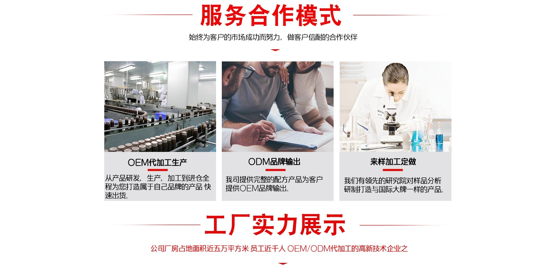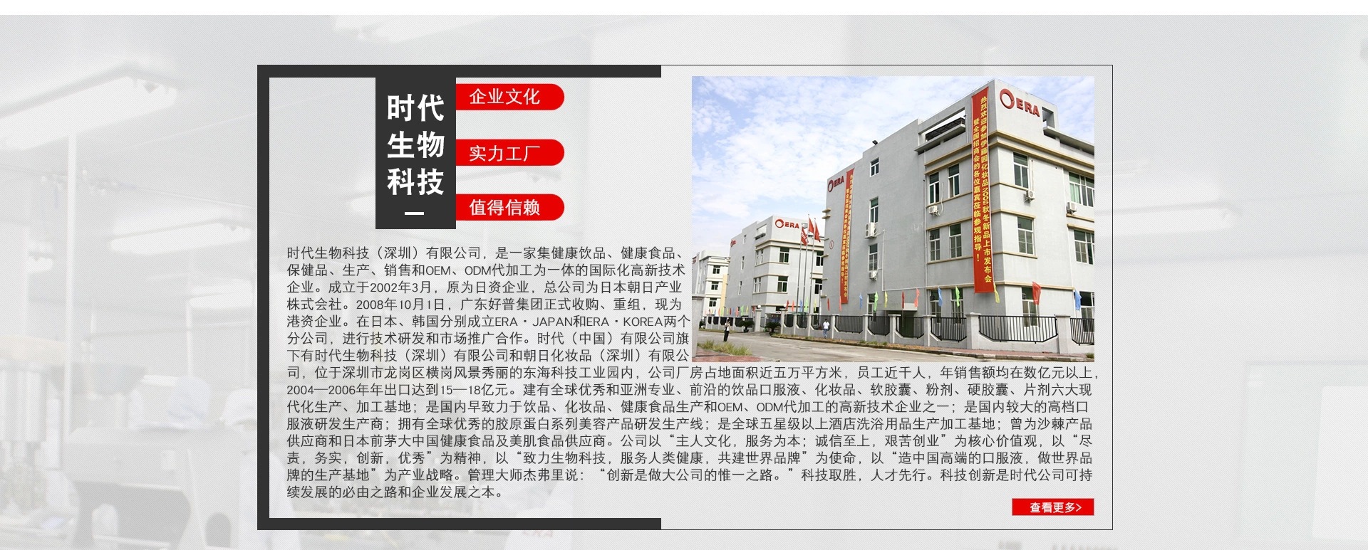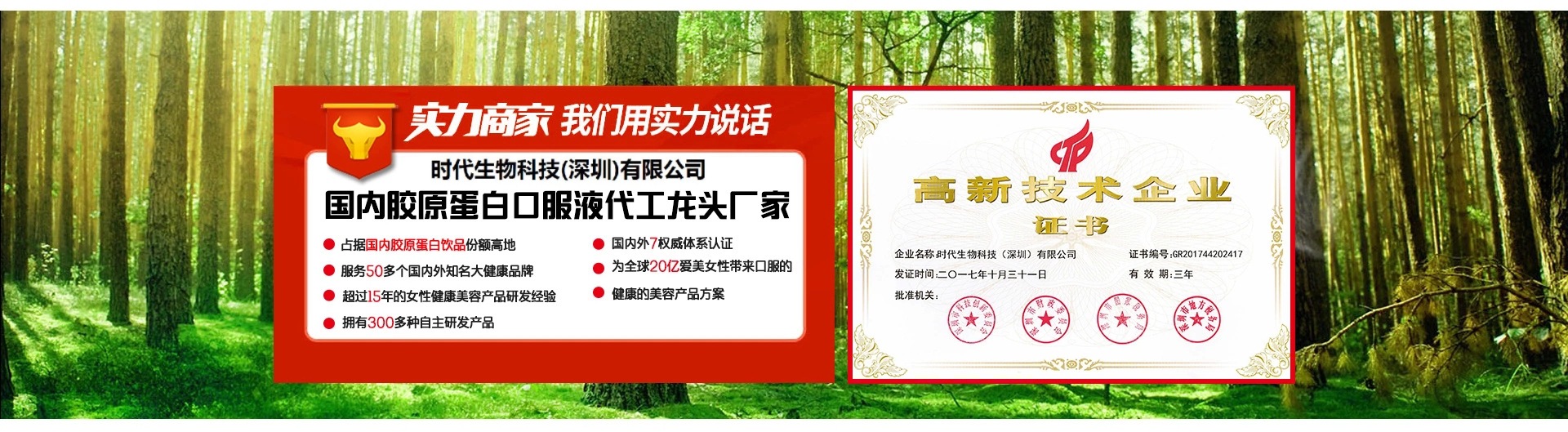 時(shí)代(中國(guó))集團(tuán)是一家以健康口服液、美容飲品、粉劑固體飲料為主的高端技術(shù)研究、產(chǎn)品開(kāi)發(fā)、生產(chǎn)和ODM代加工為一體的國(guó)際化高新技術(shù)跨國(guó)企業(yè)集團(tuán)。時(shí)代是國(guó)內(nèi)開(kāi)創(chuàng)和領(lǐng)銜50ml系列健康口服液、時(shí)尚飲品ODM代加工生產(chǎn)的高新技術(shù)企業(yè),在國(guó)內(nèi)產(chǎn)能和規(guī)模均較大,擁有全球前沿的工藝技術(shù)和自動(dòng)化生產(chǎn)線,膠原蛋白系列產(chǎn)品代加工占據(jù)國(guó)內(nèi)市場(chǎng)較大份額。 18年口服液研發(fā)及生產(chǎn)經(jīng)驗(yàn); 建成3個(gè)大型現(xiàn)代化工廠,南北方生產(chǎn)基地合計(jì)超8萬(wàn)平米; 擁有中、日、韓等地5個(gè)高級(jí)研發(fā)中心及實(shí)驗(yàn)室; 合作客戶遍布全球45個(gè)國(guó)家和地區(qū); 服務(wù)品牌1000個(gè)以上; 20多項(xiàng)相關(guān)發(fā)明專利; 1個(gè)綠色巨人健康管理培訓(xùn)學(xué)院; 國(guó)內(nèi)開(kāi)創(chuàng)并引領(lǐng)50ml口服液發(fā)展潮流; 與國(guó)內(nèi)多所高校展開(kāi)校企合作。