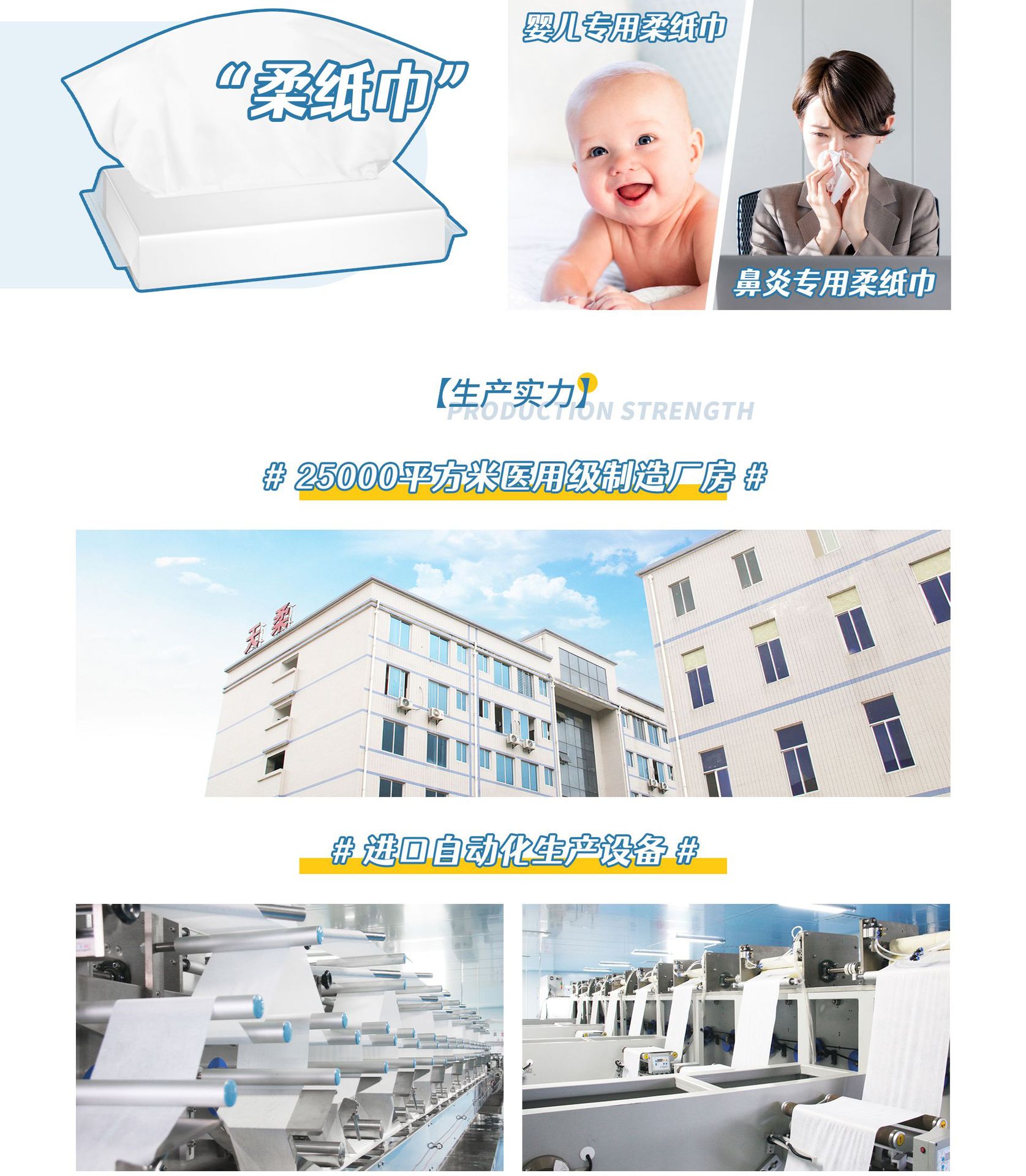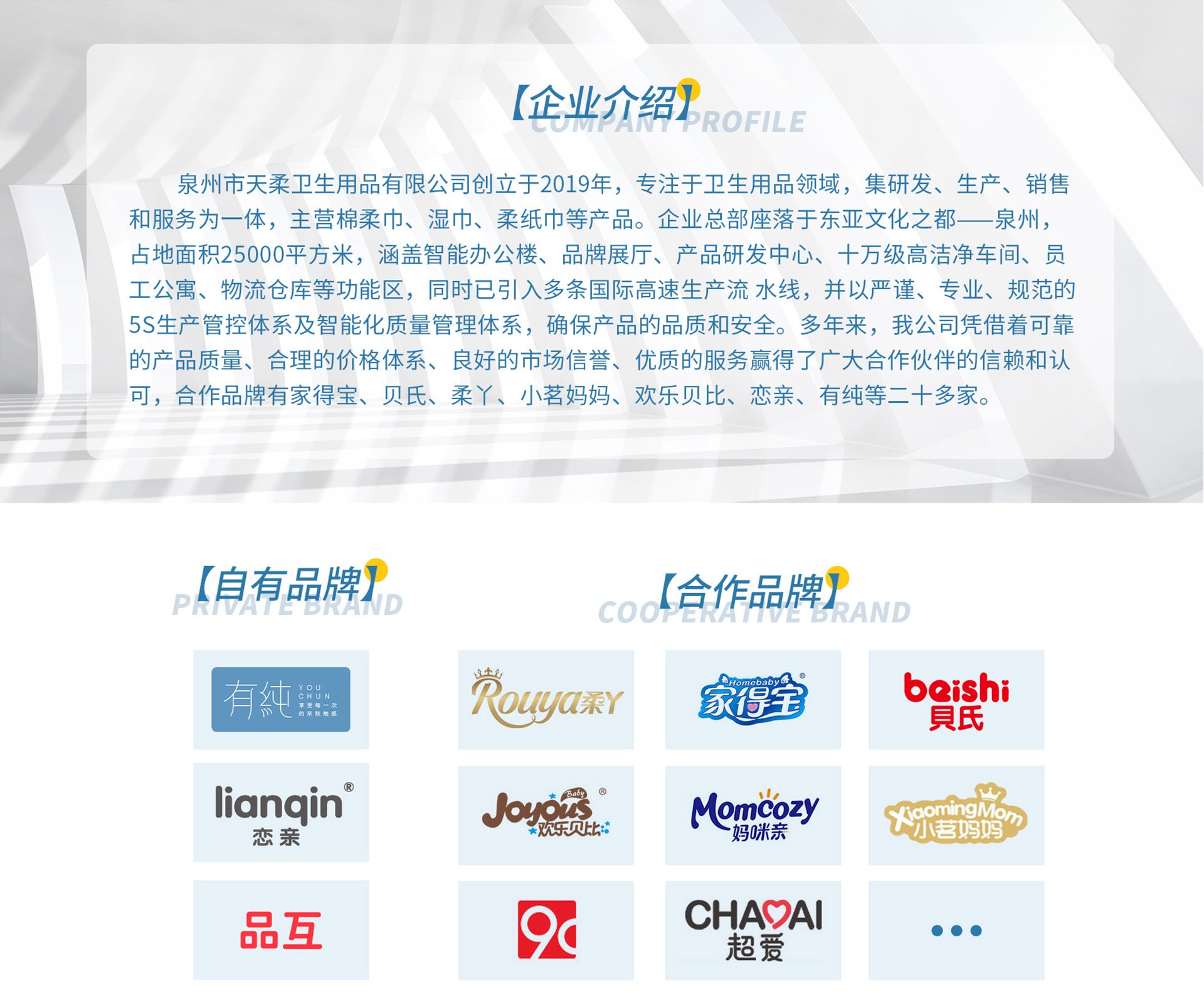 泉州市天柔衛(wèi)生用品有限公司創(chuàng)立于2019年,注冊資本1500萬,硬件設(shè)備投入5000萬,隸屬天嬌集團(tuán)(自2005年起已深耕母嬰行業(yè)15年,擁有家得寶、貝氏、柔丫、9C、戀親等多個(gè)知名品牌,年銷售總額達(dá)30多億)。 企業(yè)總部座落于東亞文化之都、衛(wèi)生用品產(chǎn)業(yè)帶——泉州,占地面積25000多平方米,涵蓋智能辦公樓、品牌展廳、產(chǎn)品研發(fā)中心、高速生產(chǎn)流水線、員工公寓、物流倉庫等功能區(qū)、是一家集科研開發(fā)、生產(chǎn)、銷售服務(wù)為一體的現(xiàn)代化企業(yè)。 目前企業(yè)擁有專業(yè)高技術(shù)人才近500人、配備9條進(jìn)口高速生產(chǎn)線、十萬級潔凈無塵車間以及投資約300萬的專業(yè)產(chǎn)品檢測實(shí)驗(yàn)室。主營產(chǎn)品包括棉柔巾、濕巾、柔紙巾、口罩等,同時(shí)仍在加快技術(shù)研發(fā),擴(kuò)大生產(chǎn)規(guī)模,不斷探索企業(yè)發(fā)展新模式。