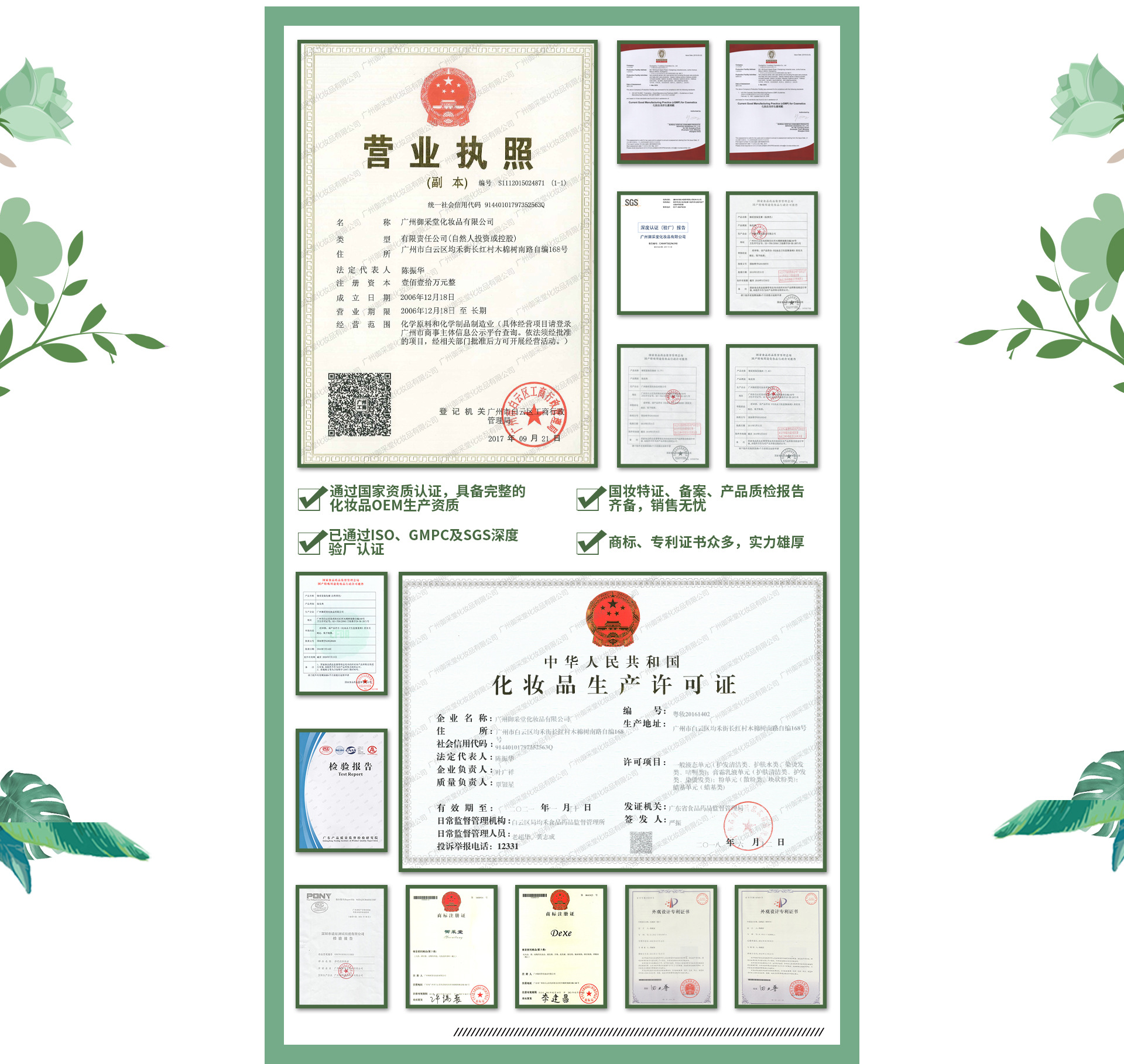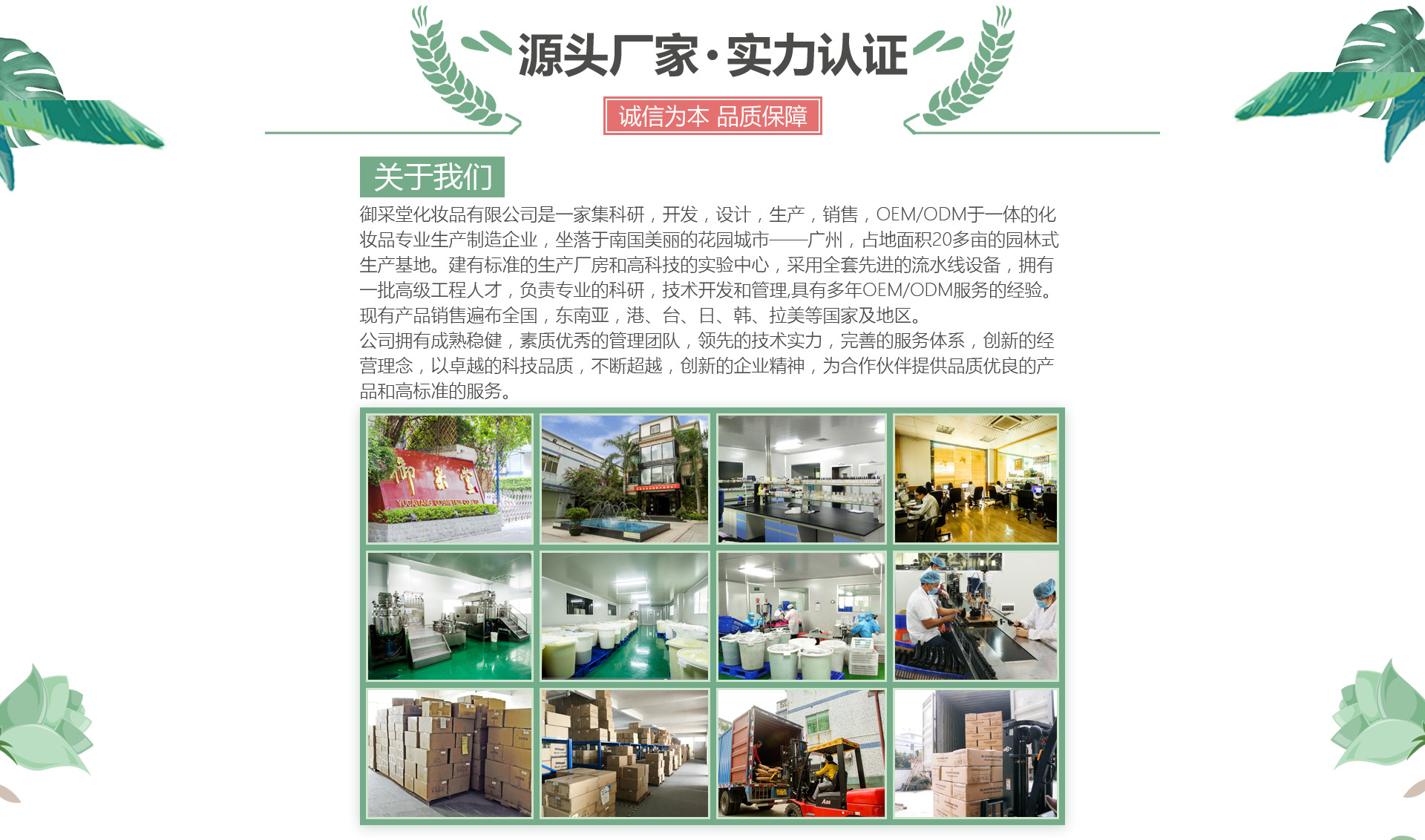 廣州御采堂化妝品有限公司,成立于2005年,是一家集科研,開發(fā),設(shè)計,生產(chǎn),銷售,OEM/ODM于一體的化妝品專業(yè)生產(chǎn)制造企業(yè),坐落于南國美麗的花園城市——廣州,建筑面積接近兩萬平方的園林式生產(chǎn)基地。建有標準的生產(chǎn)廠房和高科技的實驗中心,采用全套先進的流水線設(shè)備,擁有一批高級工程人才,負責(zé)專業(yè)的科研,技術(shù)開發(fā)和管理,具有多年OEM/ODM服務(wù)的經(jīng)驗?,F(xiàn)有產(chǎn)品銷售遍布全國,東南亞,港、臺、日、韓、拉美等國家及地區(qū)。