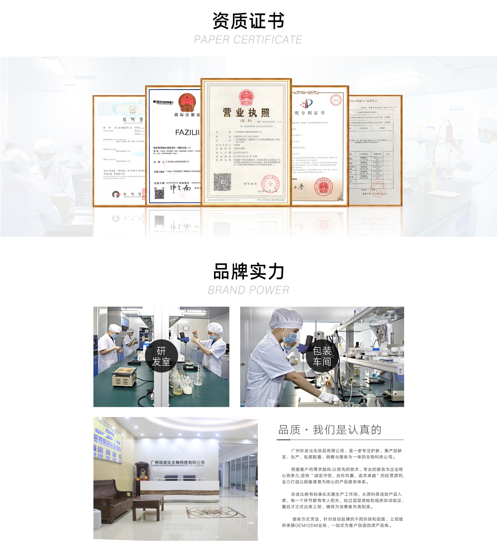 廣州珍波比化妝品有限公司是面部護(hù)理產(chǎn)品、面膜、護(hù)膚代加工、OEM、ODM、原液、凍干粉、水乳套裝、精華、彩妝、個人護(hù)理產(chǎn)品等產(chǎn)品專業(yè)生產(chǎn)加工的公司,擁有完整、科學(xué)的質(zhì)量管理體系。廣州珍波比化妝品有限公司的誠信、實力和產(chǎn)品質(zhì)量獲得業(yè)界的認(rèn)可。歡迎各界朋友蒞臨參觀、指導(dǎo)和業(yè)務(wù)洽談。