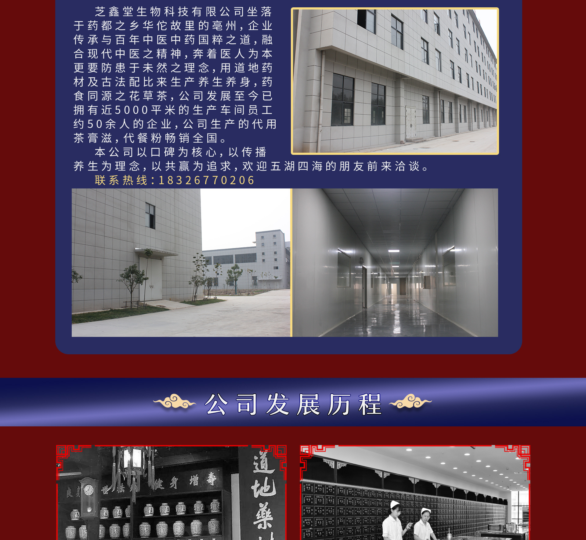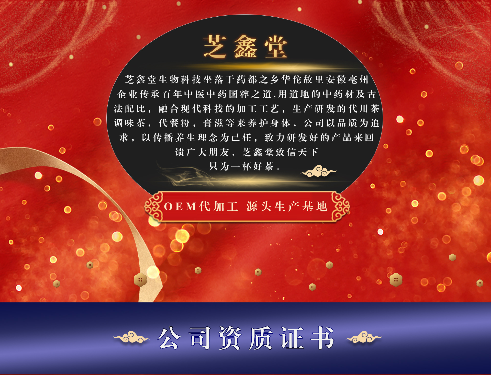 安徽芝鑫堂生物科技公司坐落四大藥材交易中心之首,譽有藥材之鄉(xiāng)的安徽亳州。公司自成立之日起,以傳播養(yǎng)生理念為己任,以誠信經營為基石,以合作共贏為追求,生產的代用茶,調味茶,膏滋,代餐粉暢銷全國,與多家知名企業(yè)代工合作。一次合作,終身朋友,歡迎全國各地的朋友參觀,指導洽談。