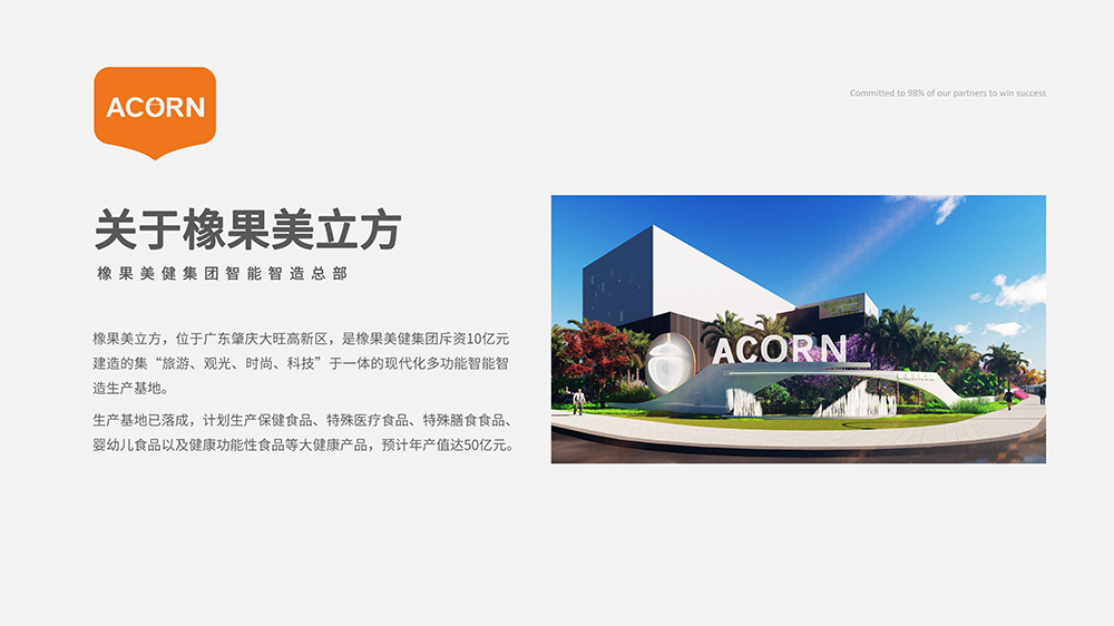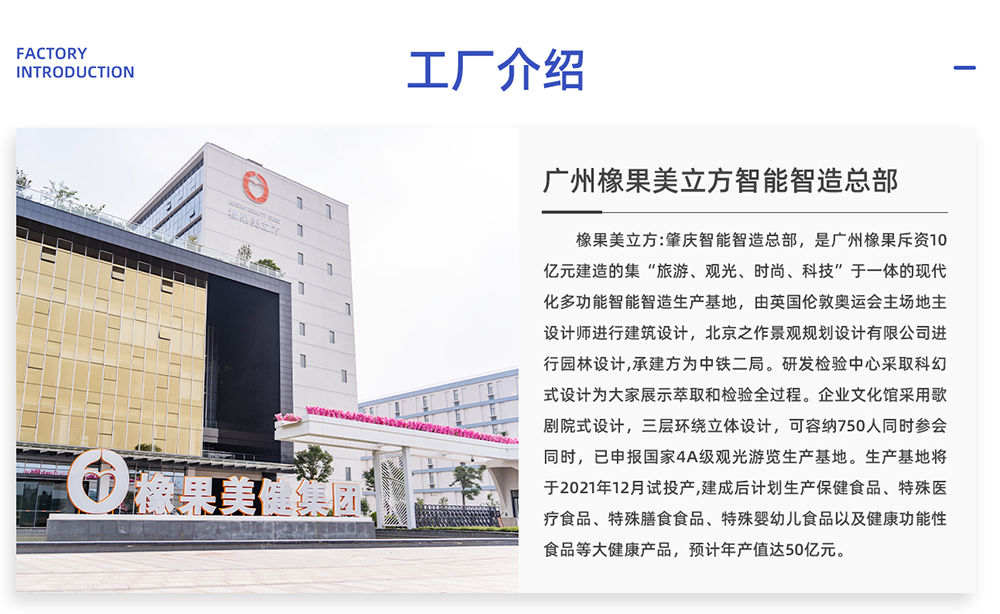 ? 集團現(xiàn)已開啟全球投資并購產(chǎn)地計劃,目前在肇慶國家高新區(qū)已建成第一個中國新興產(chǎn)業(yè)示范基地——智能智造總部橡果美立方,含5大食品類型生產(chǎn)線,預計年總產(chǎn)值將超50億。