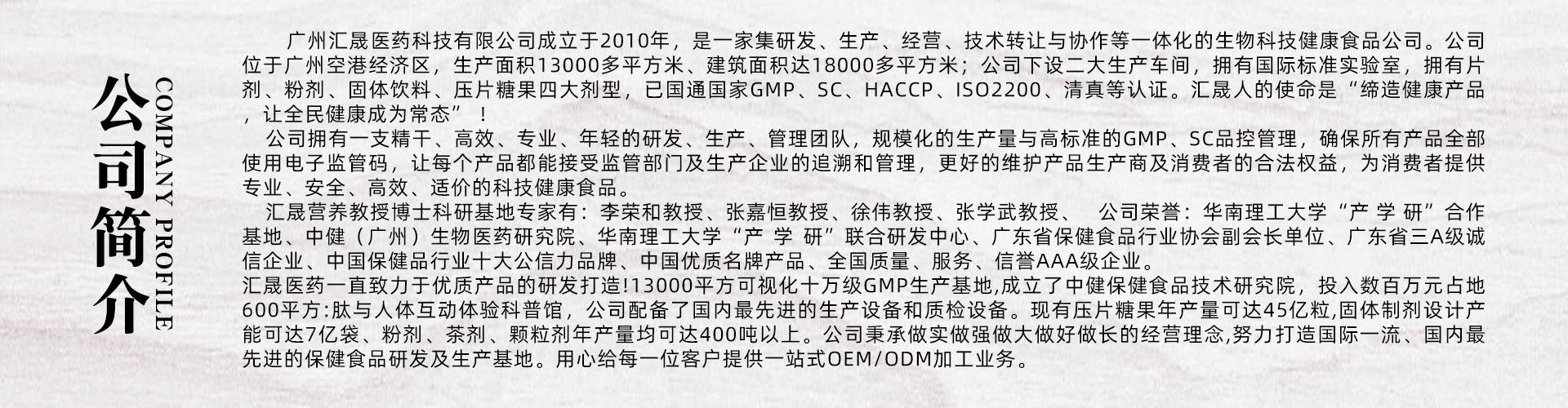 廣州匯晟醫(yī)藥科技有限公司成立于2010年,是一家集研發(fā)、生產(chǎn)、經(jīng)營、技術(shù)轉(zhuǎn)讓與協(xié)作等一體化的生物科技健康食品公司。公司位于廣州空港經(jīng)濟(jì)區(qū),生產(chǎn)面積13000多平方米、建筑面積達(dá)18000多平方米;公司下設(shè)保健食品、功能性營養(yǎng)食品、二大生產(chǎn)車間,擁有國際標(biāo)準(zhǔn)實(shí)驗(yàn)室,擁有軟件囊、、片劑、粉劑、顆粒劑、固體飲料、壓片糖果六大劑型,已國通國家GMP、SC、HACCP、ISO2200、清真等認(rèn)證。匯晟人的使命是“締造健康產(chǎn)品,讓全民健康成為常態(tài)”!