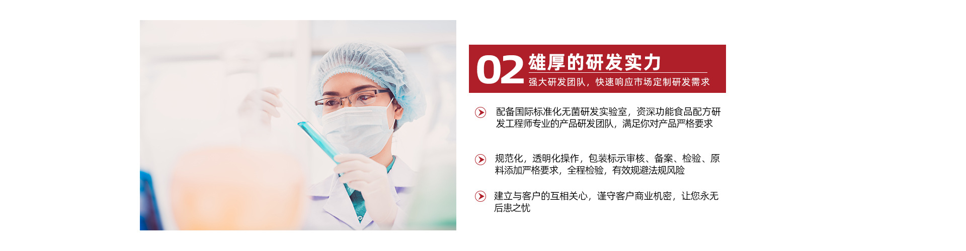 公司擁有一支精干、高效、專業(yè)、年輕的研發(fā)、生產(chǎn)、管理團(tuán)隊(duì),規(guī)?;纳a(chǎn)量與高標(biāo)準(zhǔn)的GMP、SC品控管理,確保所有產(chǎn)品全部使用電子監(jiān)管碼,讓每個(gè)產(chǎn)品都能接受監(jiān)管部門及生產(chǎn)企業(yè)的追溯和管理,更好的維護(hù)產(chǎn)品生產(chǎn)商及消費(fèi)者的合法權(quán)益,為消費(fèi)者提供專業(yè)、安全、高效、適價(jià)的科技健康食品。