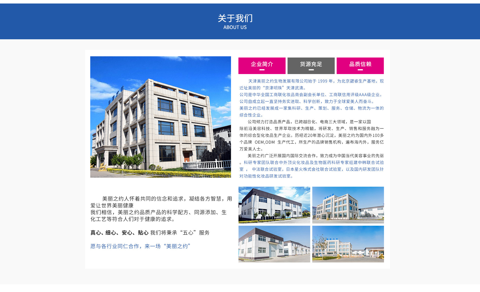 天津美麗之約生物發(fā)展有限公司始于 1999 年,現(xiàn)遷址美麗的“京津明珠”天津武清。 公司是中華全國工商聯(lián)化妝品商會副會長單位、工商聯(lián)信用評級AAA級企業(yè)。 美麗之約已經(jīng)發(fā)展成一家集科研、生產(chǎn)、策劃、服務、倉儲、物流為一體的綜合性企業(yè)。 公司傾力打造優(yōu)質產(chǎn)品,已跨越專業(yè)、日化、電商三大領域,是一家以國際前沿美容科技、發(fā)酵萃取技術為精髓,將研發(fā)、生產(chǎn)、銷售和全方位服務融為一體的綜合型化妝品生產(chǎn)企業(yè)。歷經(jīng)近20 年潛心沉淀,美麗之約為國內外100多個品牌 OEM,ODM 生產(chǎn)代工,所生產(chǎn)的品牌銷售機構,遍布海內外;美麗之約 做好賣的產(chǎn)品,讓美麗成為一種習慣!
