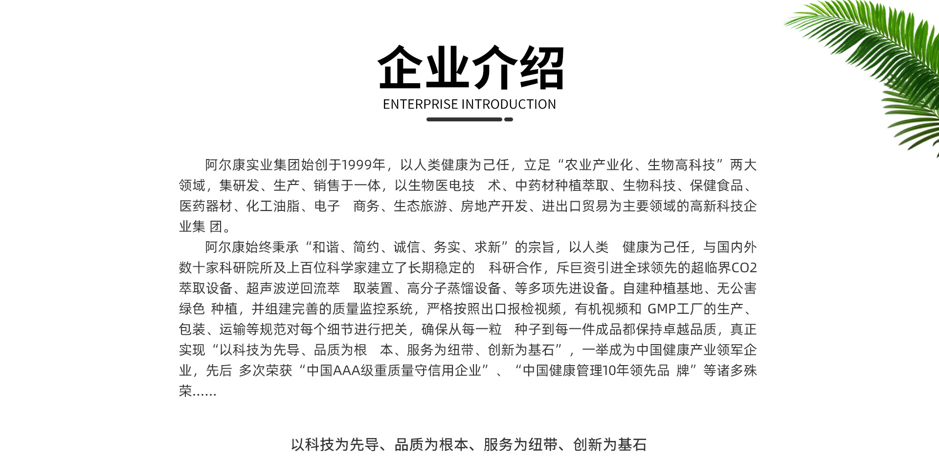 阿爾康始終秉承“和諧、簡約、誠信、務(wù)實、求新”的宗旨,以人類健康為己任,與國內(nèi)外數(shù)十家科研院所及上百位科學(xué)家建立了長期穩(wěn)定的科研合作,斥巨資引進(jìn)全球領(lǐng)先的超臨界CO2萃取設(shè)備、超聲波逆回流萃取裝置、高分子蒸餾設(shè)備、等多項先進(jìn)設(shè)備。自建種植基地、無公害綠色種植,并組建完善的質(zhì)量監(jiān)控系統(tǒng),嚴(yán)格按照出口報檢視頻,有機(jī)視頻和GMP工廠的生產(chǎn)包裝、運(yùn)輸?shù)纫?guī)范對每個細(xì)節(jié)進(jìn)行把關(guān),確保從每一粒種子到每一件成品都保持卓越品質(zhì),真正實現(xiàn)“以科技為先導(dǎo)、品質(zhì)為根本、服務(wù)為紐帶、創(chuàng)新為基石”,一舉成為中國健康產(chǎn)業(yè)領(lǐng)軍企業(yè),先后多次榮獲“中國AAA級重質(zhì)量守信用企業(yè)”、“中國健康管理10年領(lǐng)先品牌”等諸多殊榮......