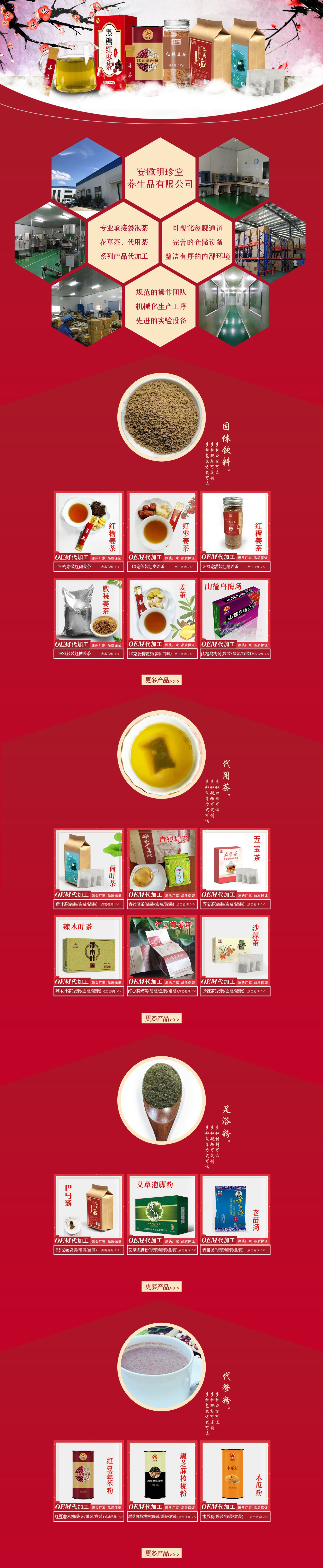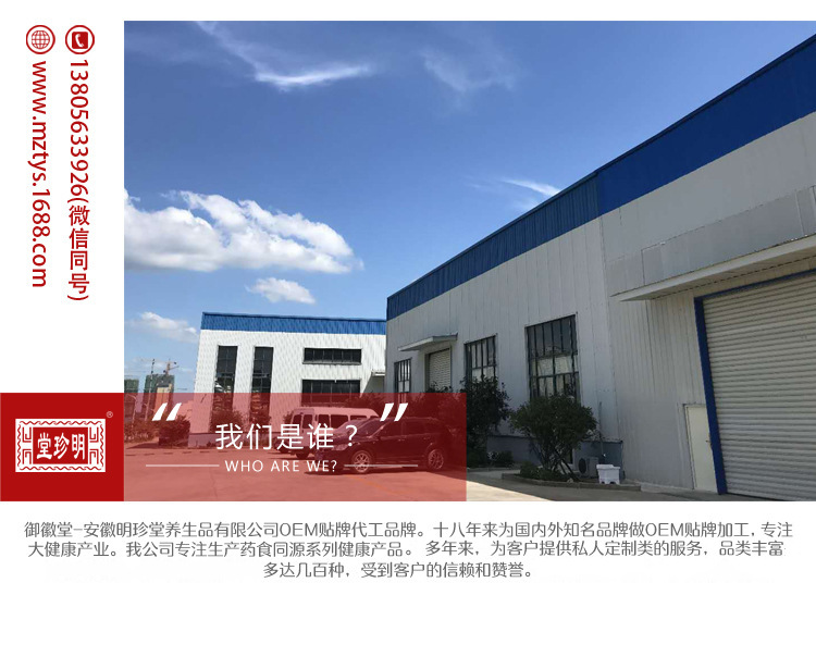 安徽明珍堂養(yǎng)生品有限公司OEM貼牌代工品牌,多年來為國內(nèi)外知名品牌做OEM貼牌加工,專注大健康產(chǎn)業(yè)。我公司專注生產(chǎn)藥食同源系列健康產(chǎn)品(固體飲料、代餐粉、健康茶飲、袋泡茶、膏滋、足浴藥浴包等),多年來,為客戶提供私人定制類的服務(wù),品類豐富多達(dá)幾百種,受到客戶的信賴和贊譽(yù)。 公司獲得“國家級星火計劃項目承擔(dān)單位”、“國家級知識產(chǎn)權(quán)優(yōu)勢企業(yè)”“安徽省省級農(nóng)業(yè)產(chǎn)業(yè)化龍頭企業(yè)” “省級電子商務(wù)示范企業(yè)” “守合同重信用單位”“安徽省十佳新銳網(wǎng)商”“安徽省著名商標(biāo)”“安徽名牌產(chǎn)品證書”等榮譽(yù)稱號!注重產(chǎn)品質(zhì)量建設(shè),相繼獲得了ISO9001質(zhì)量管理體系認(rèn)證及SC認(rèn)證,,建立了嚴(yán)格的生產(chǎn)工藝和現(xiàn)場5S管理品控體系。 客戶的需求就是我們的要求,客戶的認(rèn)可就是我們的責(zé)任。 走